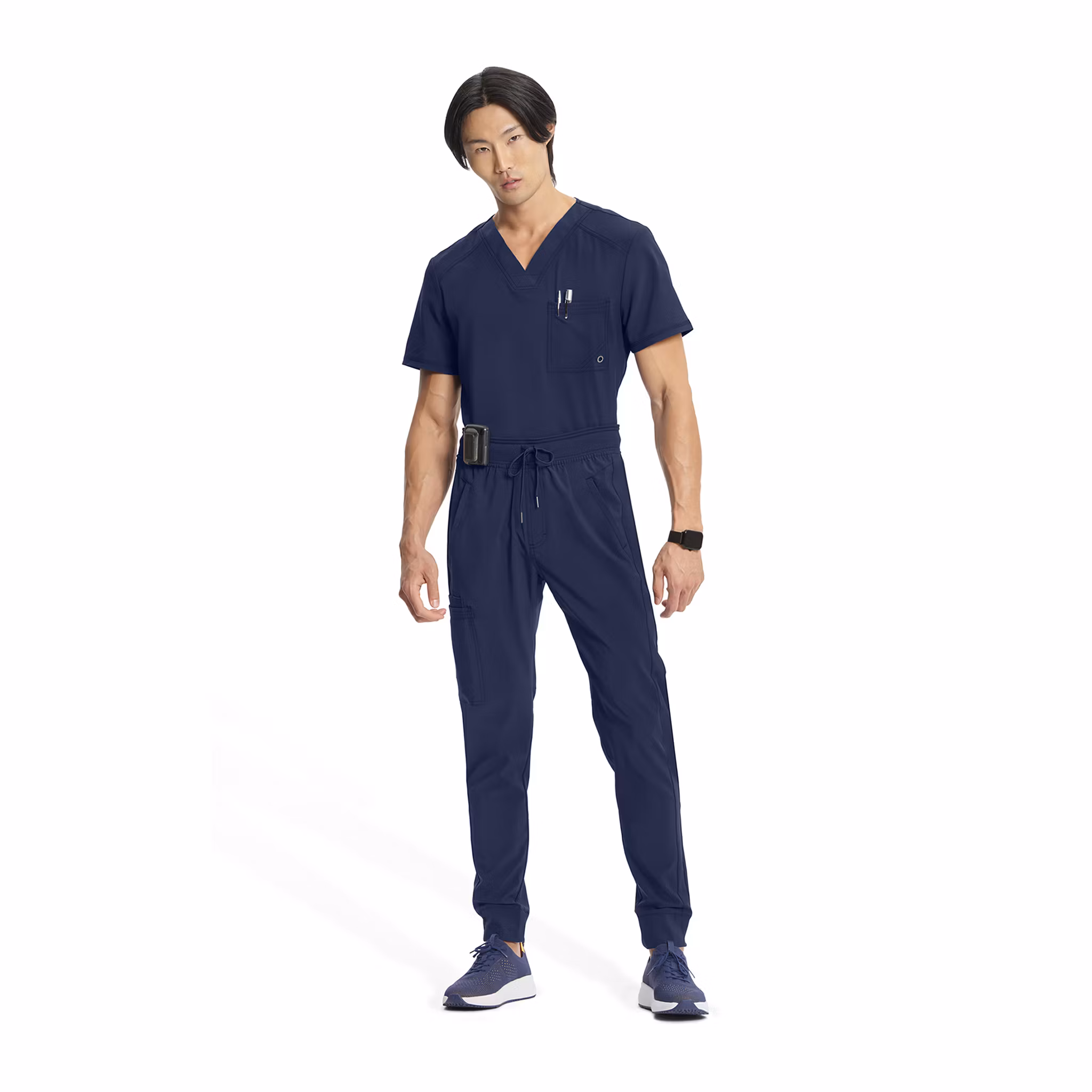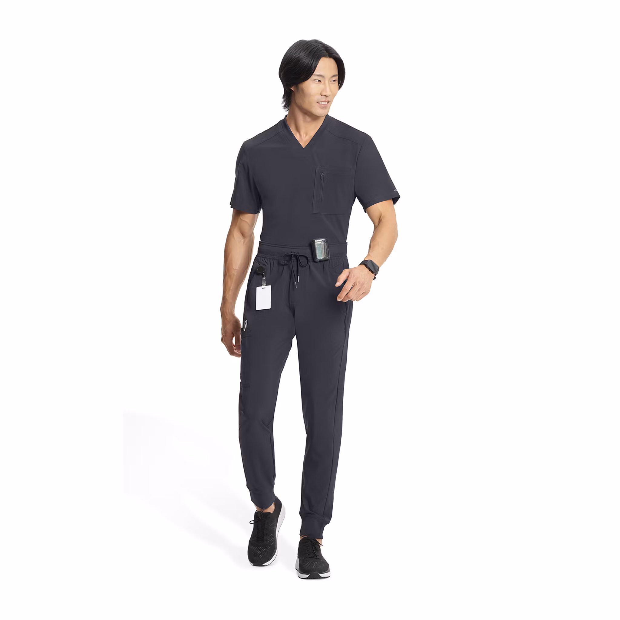 En modern och stilren vårdbyxa i joggermodell för herr, framtagen för att kombinera komfort och funktion i arbetsvardagen. Byxan har en mellanhög midja med mjuk resår, dekorativ fuskgylf och ribbade benslut baktill för en följsam passform. Utrustad med fem fickor, inklusive tre dragkedjeförsedda fickor och en cargoficka med mobilficka – perfekt för säker och smidig förvaring.