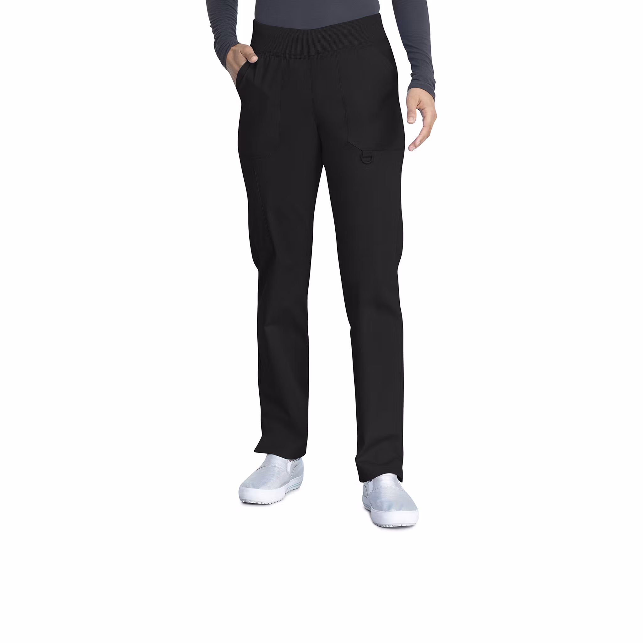 En bekväm och modern vårdbyxa med medelhög midja och lätt avsmalnande ben. Byxan har en mjuk och följsam trikåmidja med invändig dragsko för justerbar passform, samt flera praktiska fickor: två rymliga framfickor med D-ring, en cargoficka med pennfack och två bakfickor. Sidslitsarna nertill ger ökad rörelsefrihet och en modern siluett.