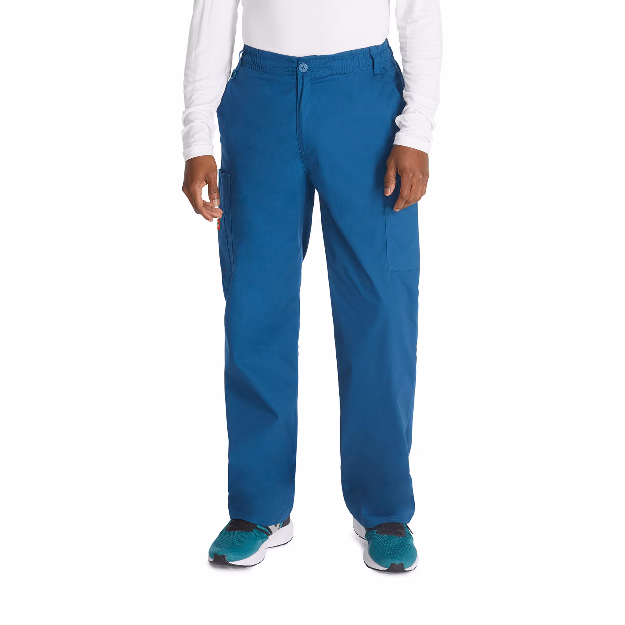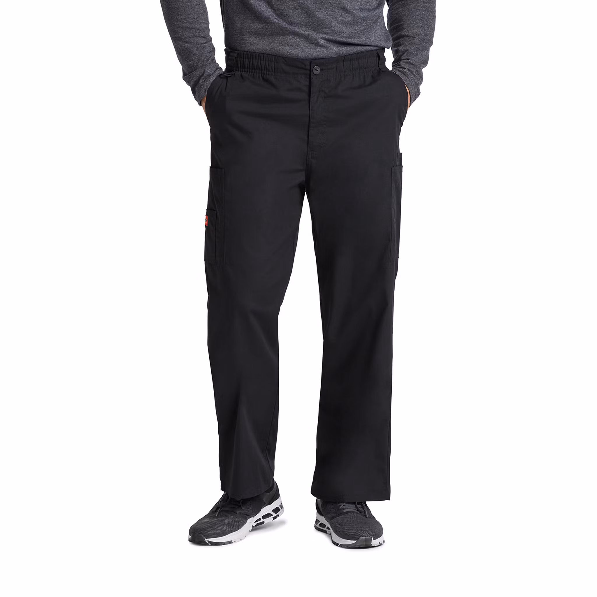 En slitstark och funktionell vårdbyxa i herrmodell med klassisk design och modern komfort. Byxan har en dragkedja fram, elastisk midja med knappstängning samt invändig dragsko för justerbar passform. Utrustad med flera praktiska fickor – snedställda framfickor, cargofickor på båda benen och en bakficka med kardborrestängning – samt en D-ring framtill för nycklar eller ID-kort.