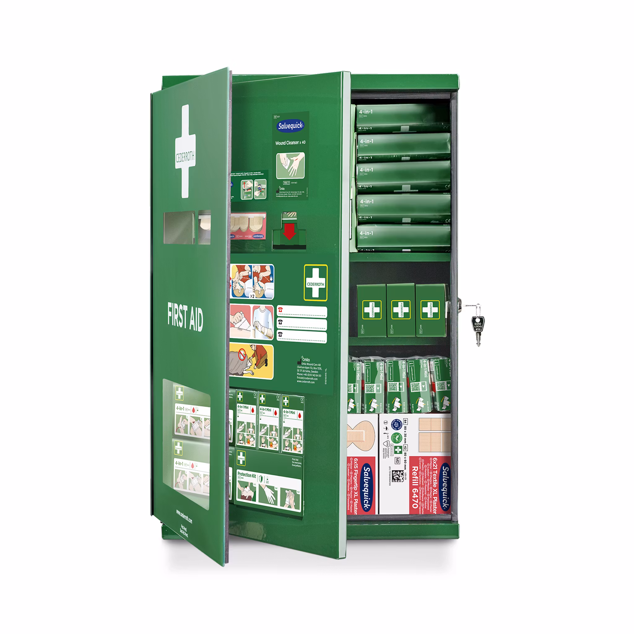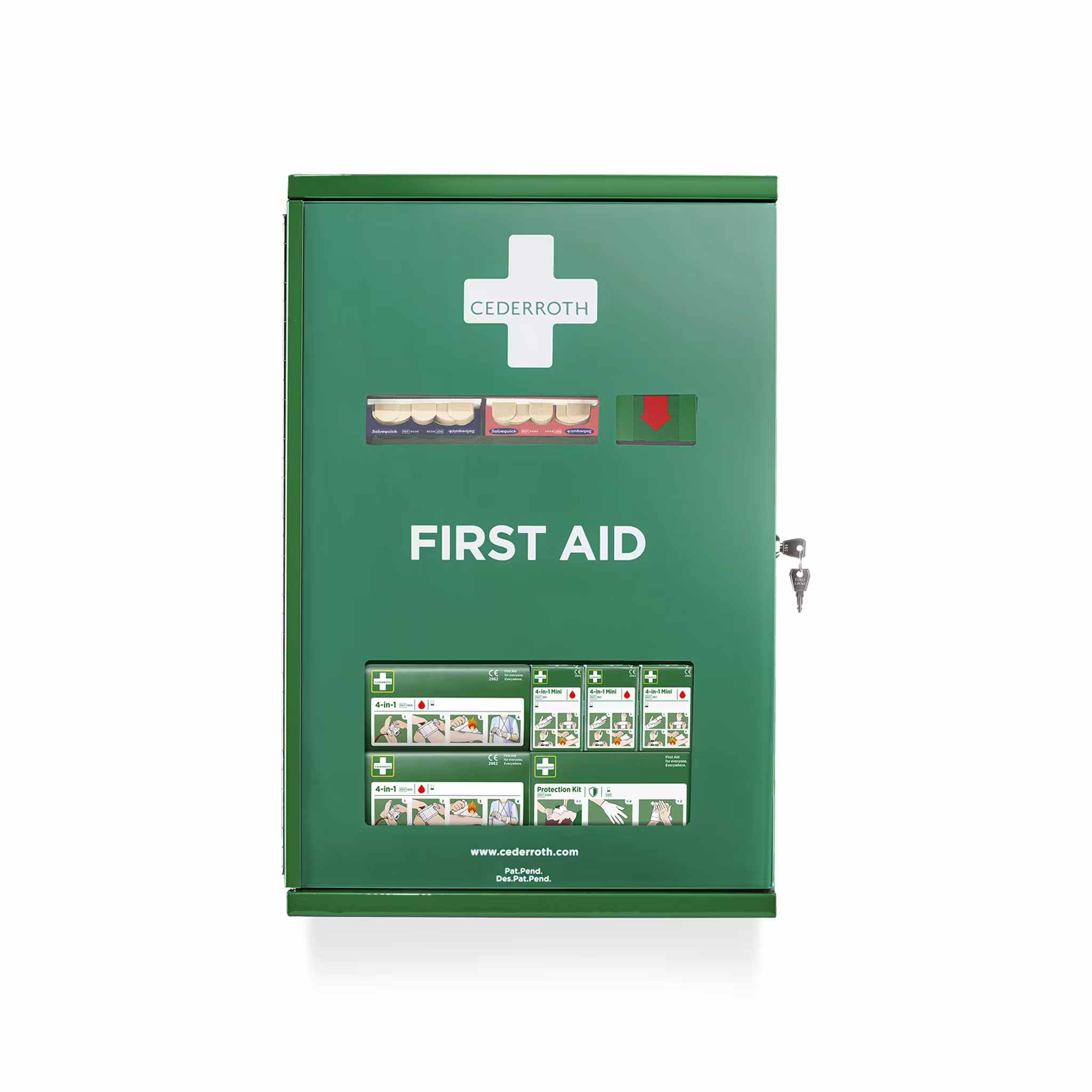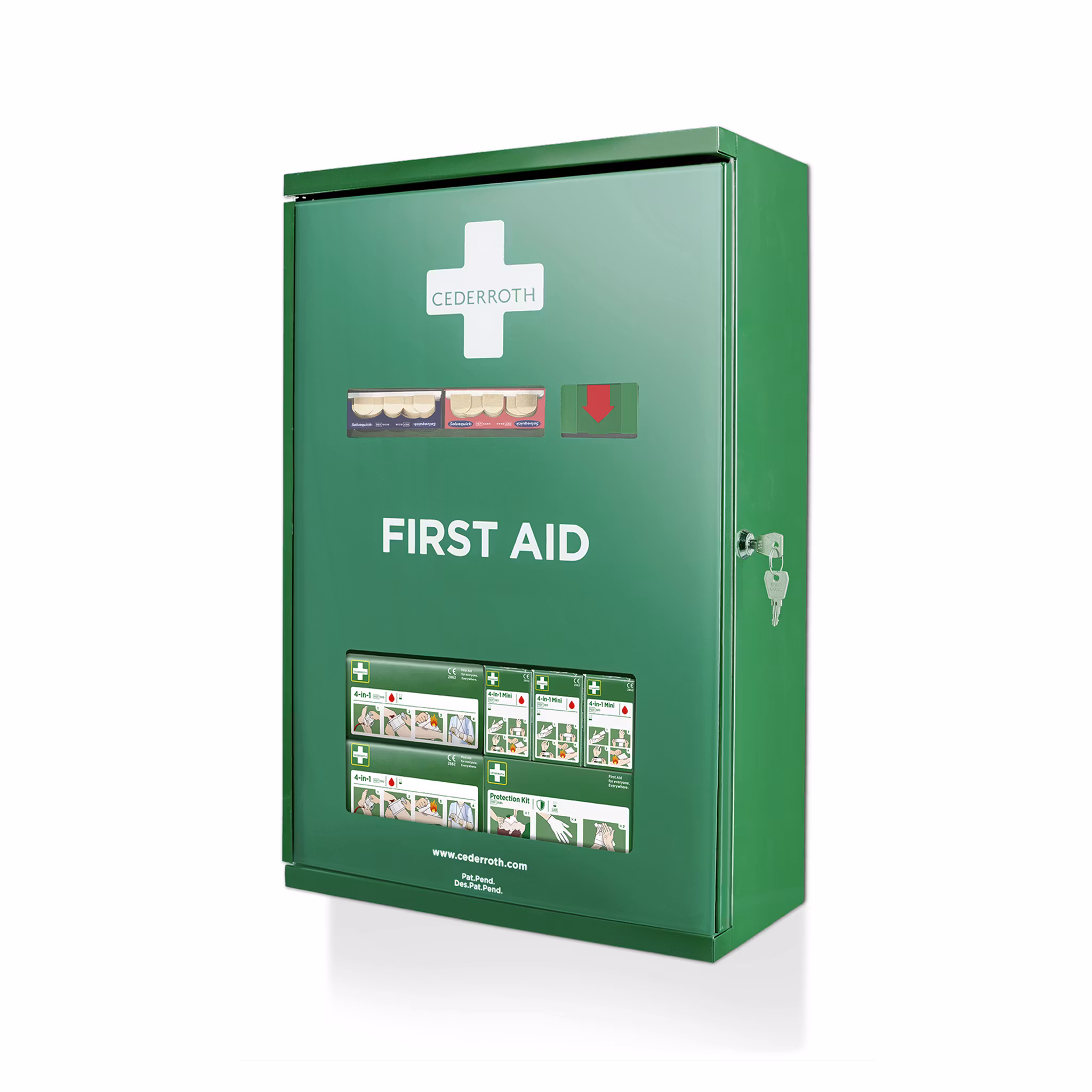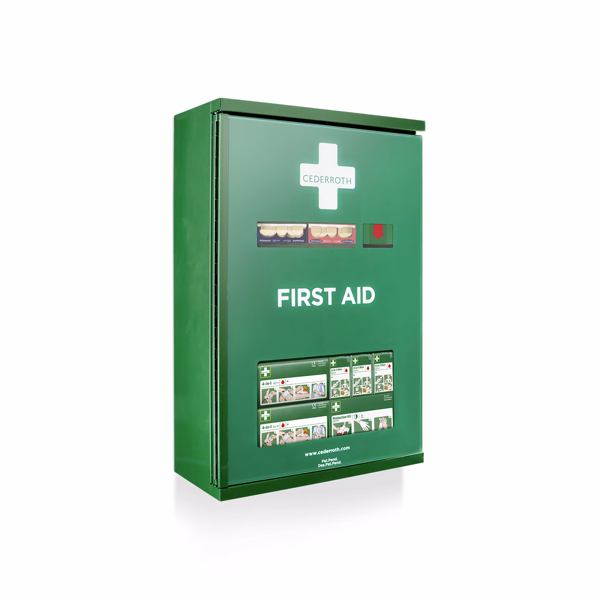 Ett robust och välorganiserat Första Hjälpen-skåp i plåt, utformat för arbetsplatser där snabb tillgång till sjukvårdsutrustning är avgörande. Skåpet är indelat i två sektioner – en yttre dammskyddad del med lättåtkomliga produkter för direkt användning, och en inre låsbar sektion med extra påfyllning. Den yttre delen fungerar som en Första Hjälpen-tavla med plexiglasdörr som skyddar innehållet mot damm och fukt.