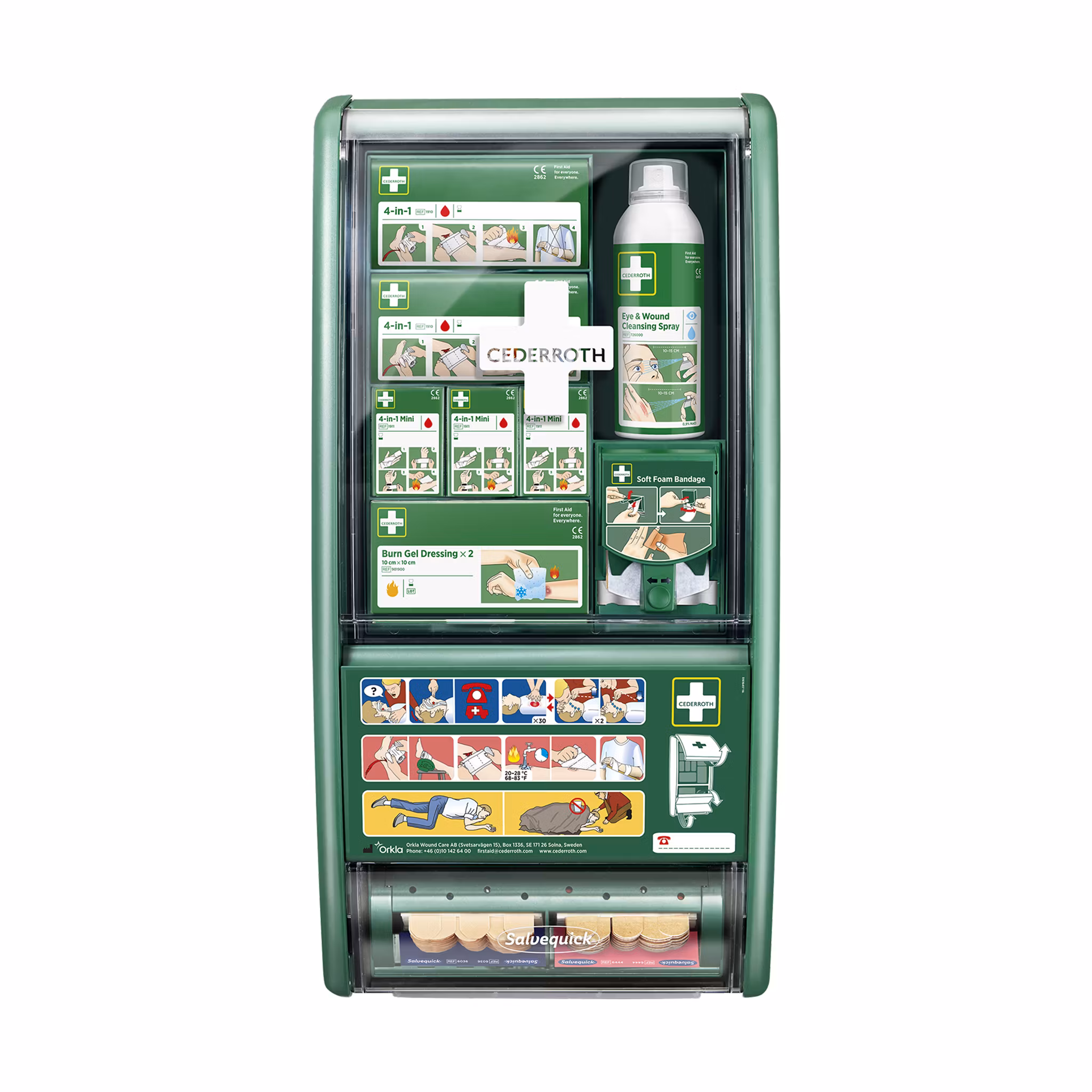 En komplett Första Hjälpen-station med produkter för de flesta typer av skador, inklusive sår- och brännskador. Stationen har en integrerad Soft Foam Dispenser med 2 meter bandage samt plåsterautomat, brännskadekompresser och ögon- och sårtvättsspray. Transparent lucka skyddar innehållet mot damm och fukt, och extra förvaringsutrymme ger plats för egna tilläggsprodukter. Från sommaren 2025 tillverkas plastdelarna av över 92 % återvunnen plast.
