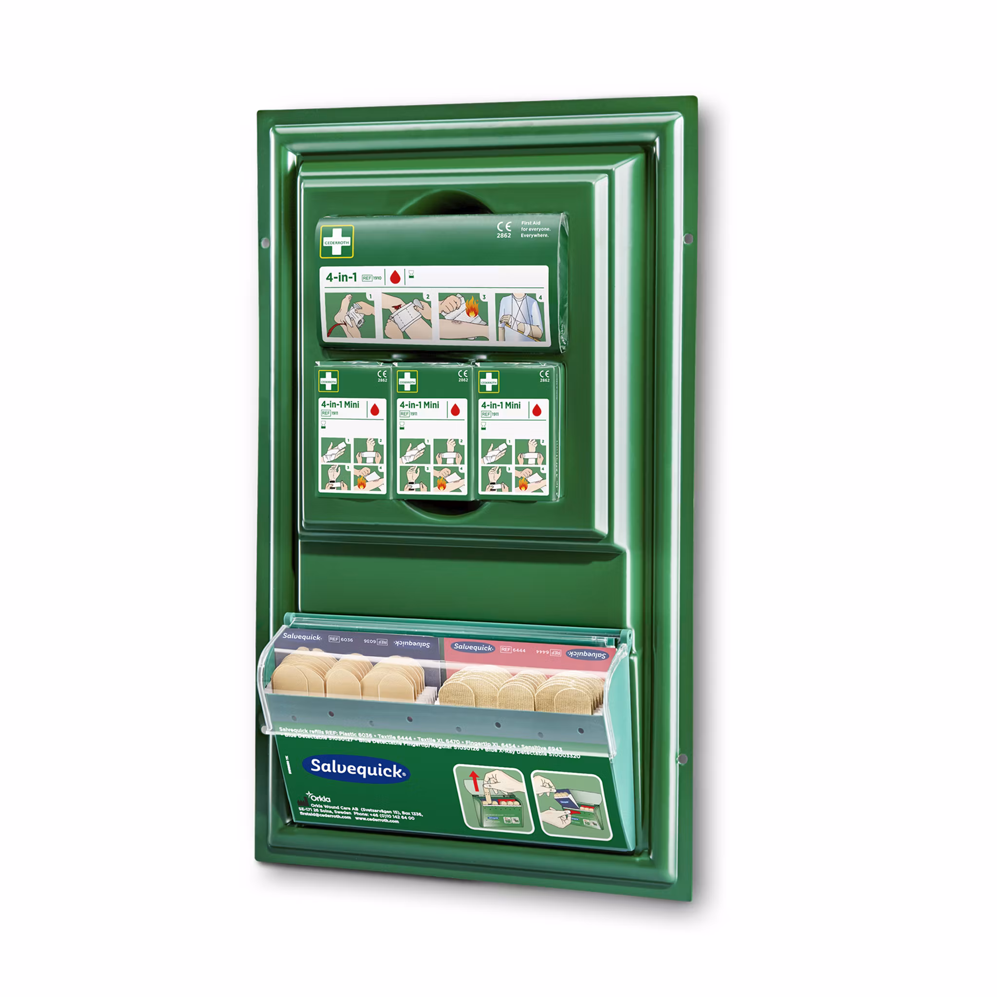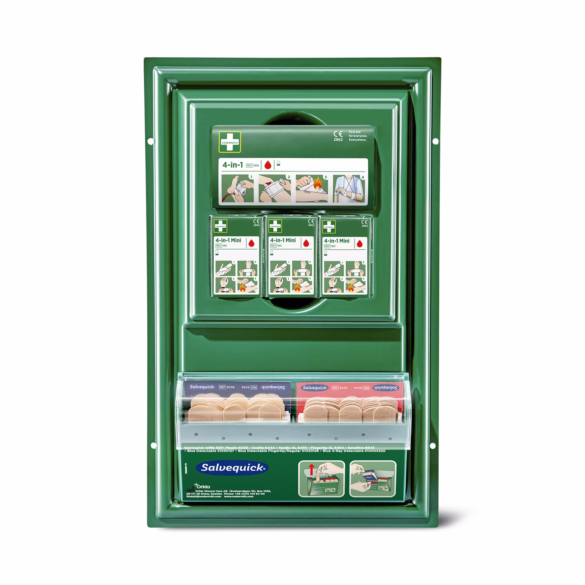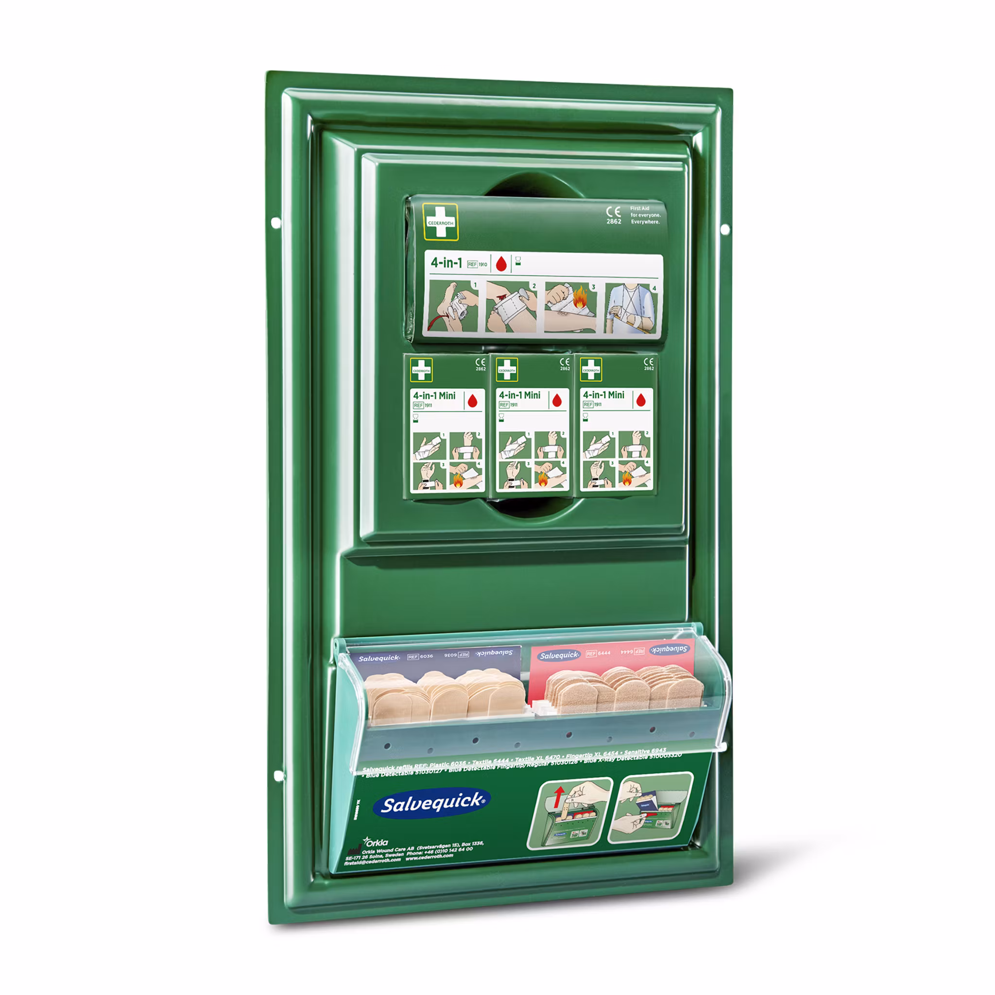 En kompakt och praktisk Första Hjälpen-tavla med plåster och blodstoppare – perfekt för mindre utrymmen eller som komplement till annan Första Hjälpen-utrustning. När plåstren dras ur automaten friläggs den ena häftytan och plåstret är direkt klart att användas, vilket sparar värdefull tid vid mindre skador.