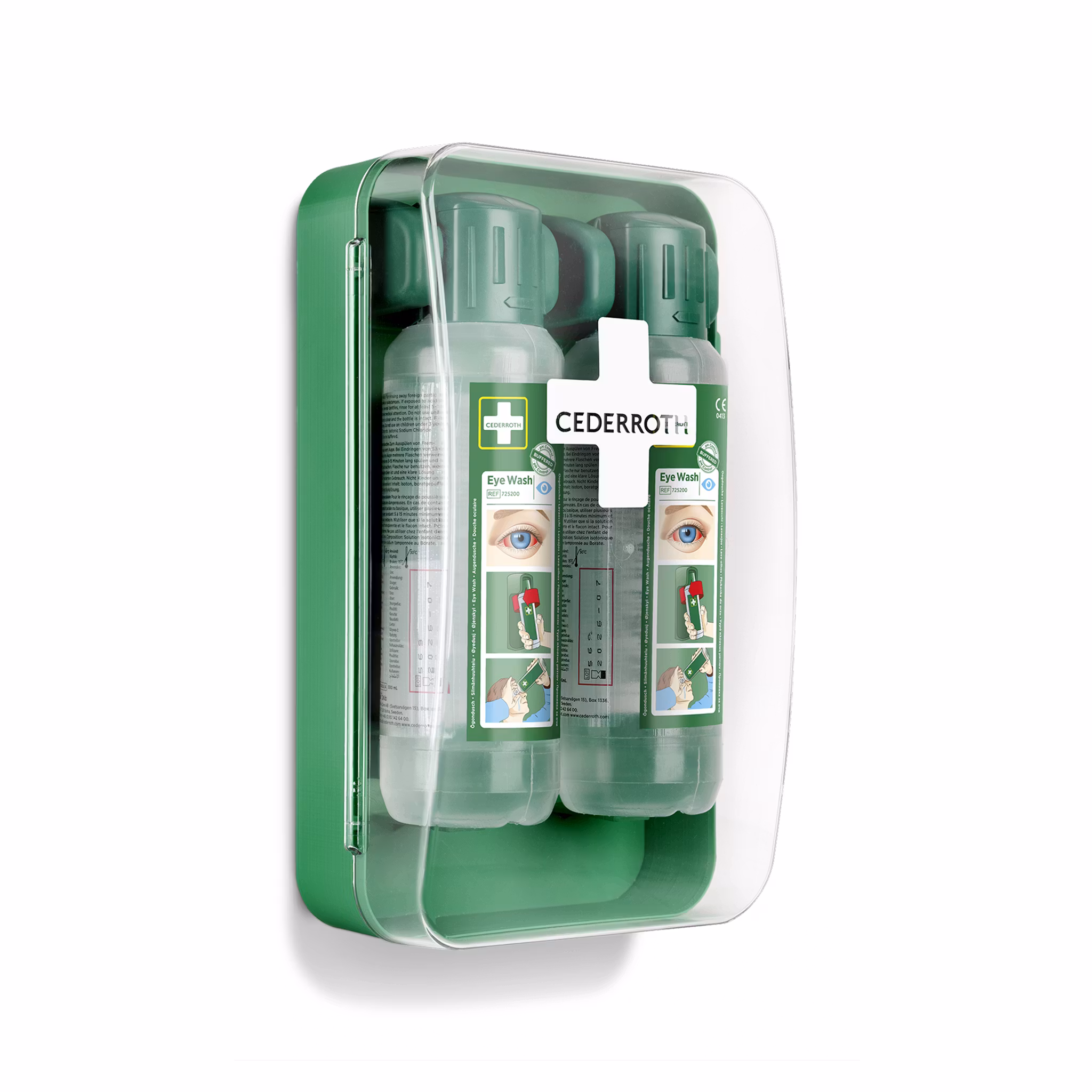 Ett kompakt och praktiskt ögonduschskåp som skyddar flaskorna mot damm och vatten. Skåpet rymmer två flaskor Cederroth Ögondusch och tar liten plats, vilket gör det idealiskt även för trånga utrymmen. Transparent lucka ger hög synlighet och enkel åtkomst vid olycka. Flaskorna öppnas automatiskt när de vrids ur hållarna, så sköljning kan påbörjas direkt. Från sommaren 2025 tillverkas plastdelarna av över 78 % återvunnen plast.