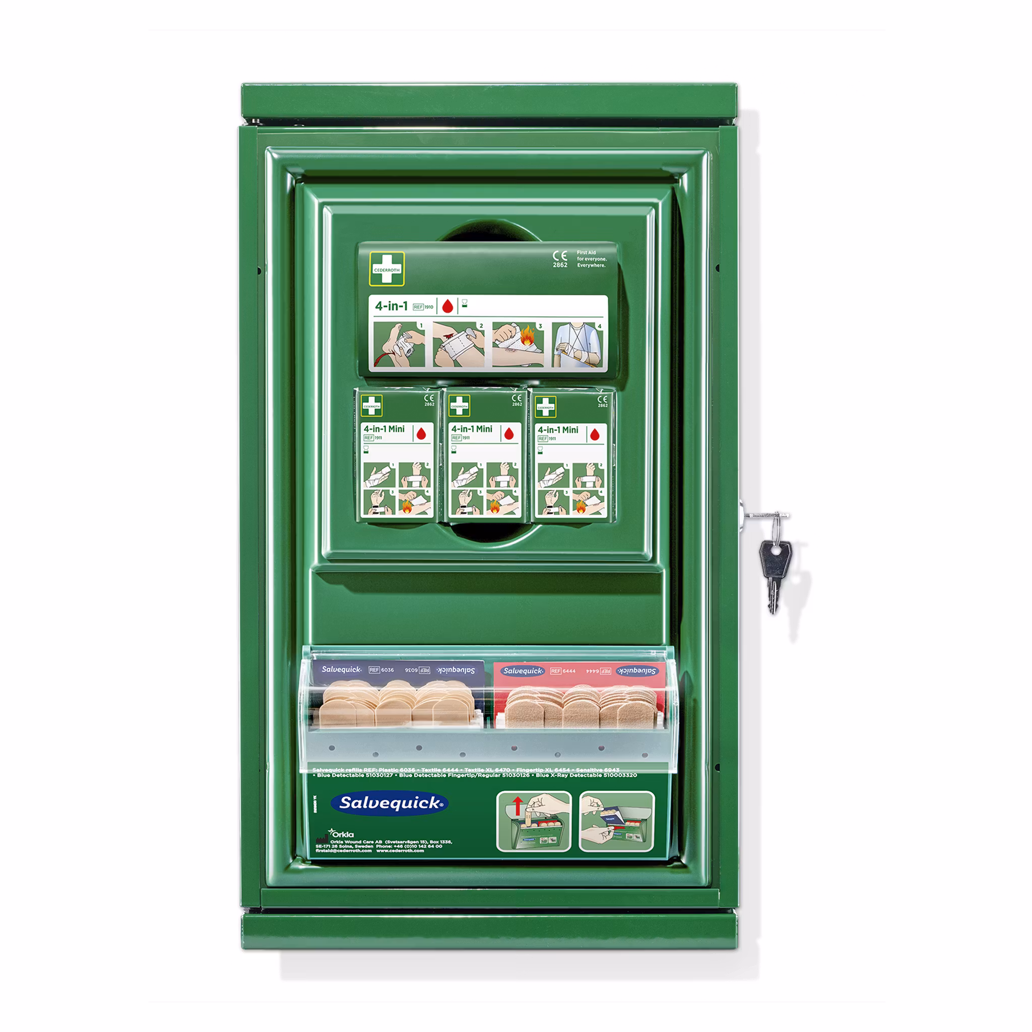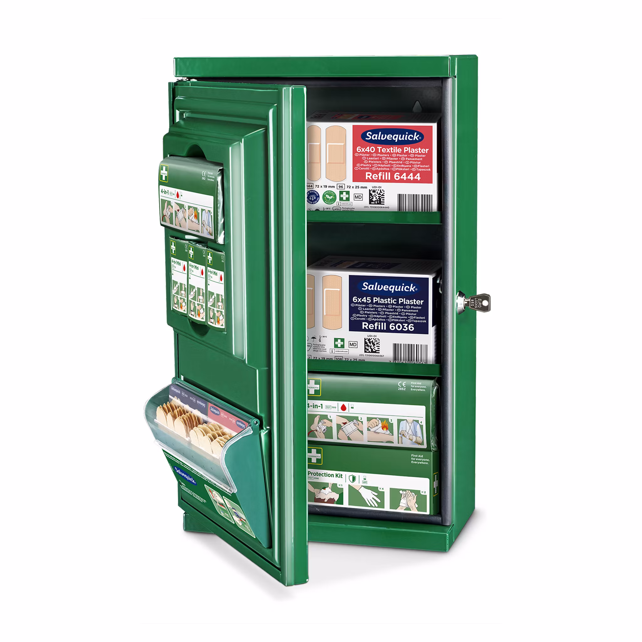 Ett kompakt och robust Första Hjälpen-skåp i plåt, utformat för mindre arbetsplatser eller som komplement till större Första Hjälpen-stationer. Skåpet har ett låsbart utrymme för påfyllning och en monterad Cederroth Första Hjälpen-tavla Mini på insidan av dörren. Den praktiska designen gör det enkelt att snabbt nå plåster och blodstoppare vid behov, samtidigt som reservmaterial hålls säkert och organiserat.