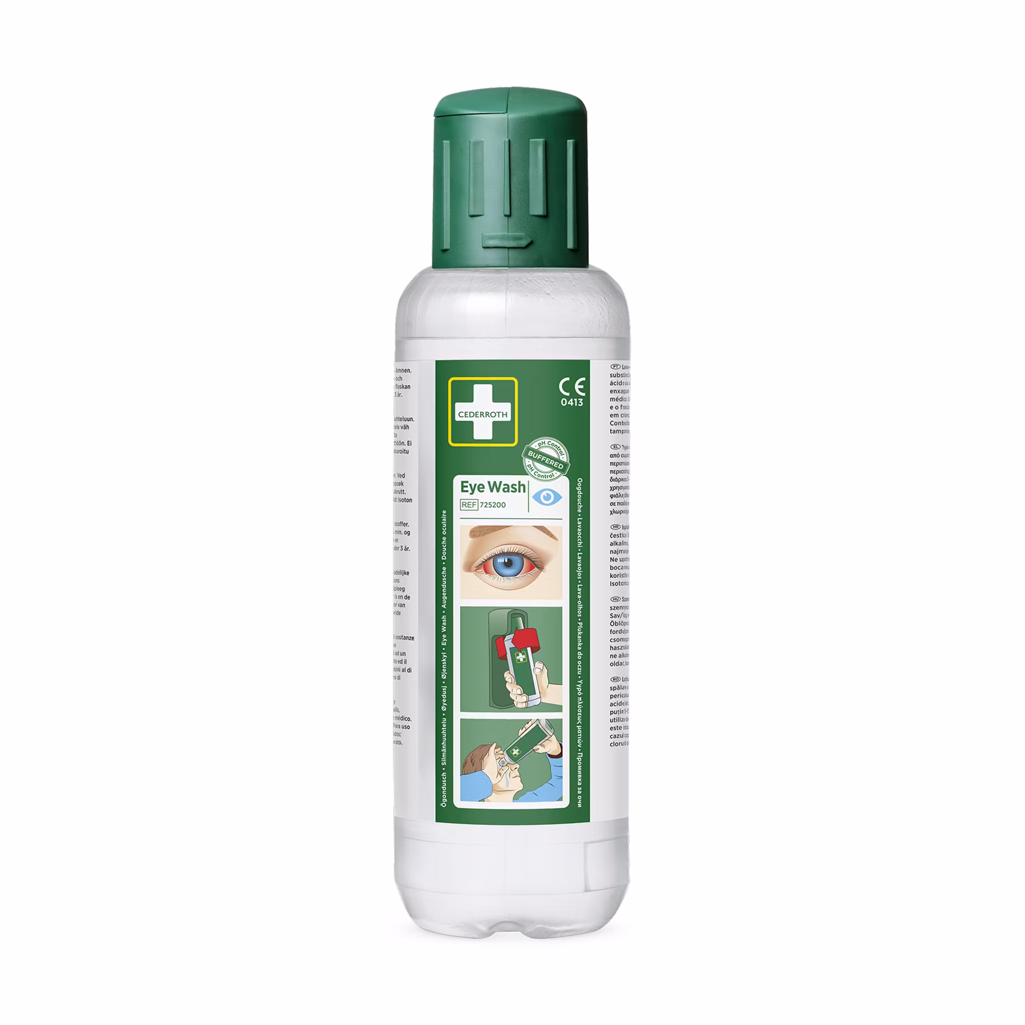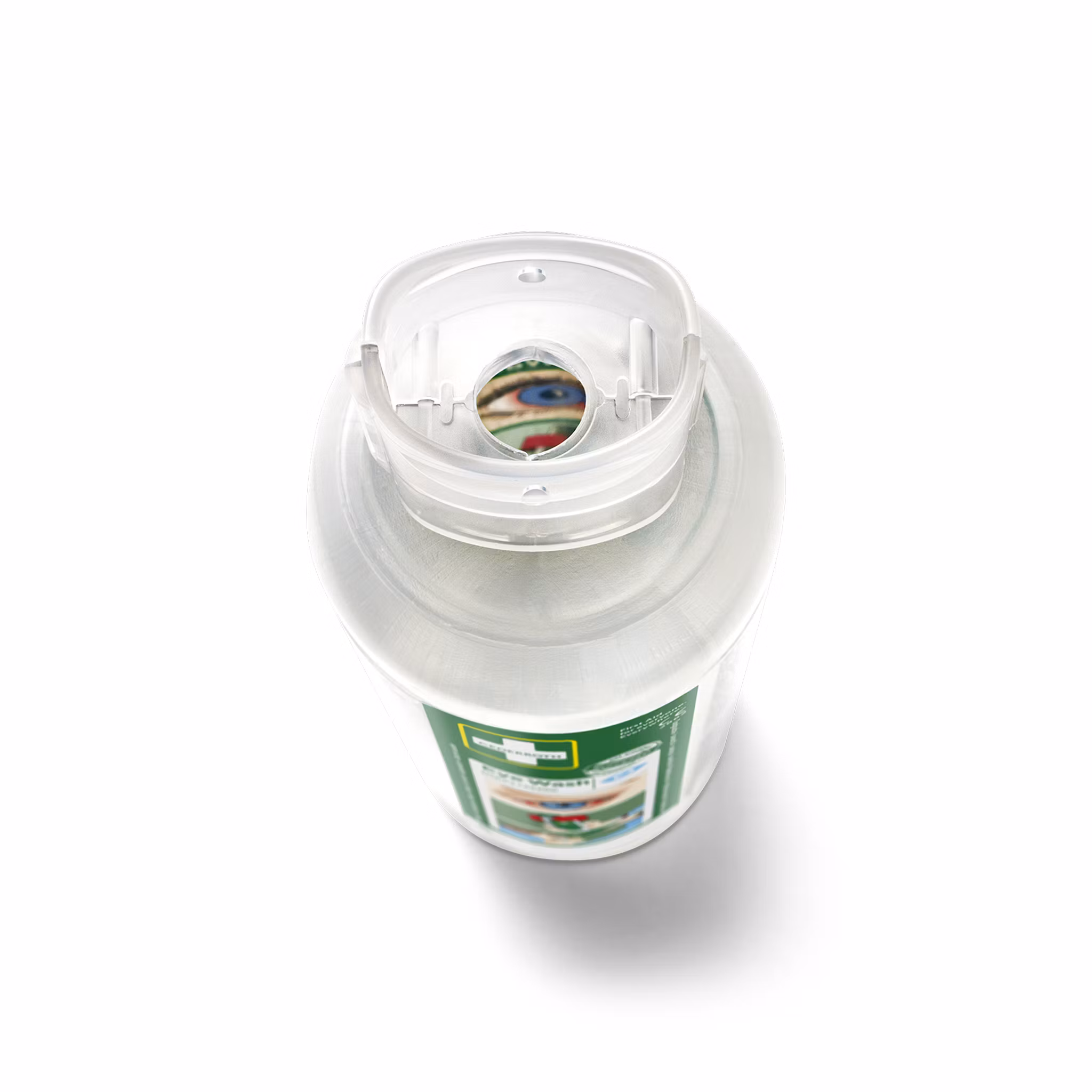 Bärbar ögondusch med steril, buffrad saltlösning som effektivt sköljer bort partiklar och skadliga ämnen vid ögonolyckor. Flaskan är lätt att öppna och aktiveras i ett steg genom att vrida bort dammskyddet. Den integrerade ögonkoppen håller ögat öppet under sköljningen och ger ett rikligt flöde utan onödigt spill. Den buffrade vätskan neutraliserar ögats pH-värde och verkar snabbare än vanlig koksaltlösning, särskilt vid stänk av alkalier och syror.