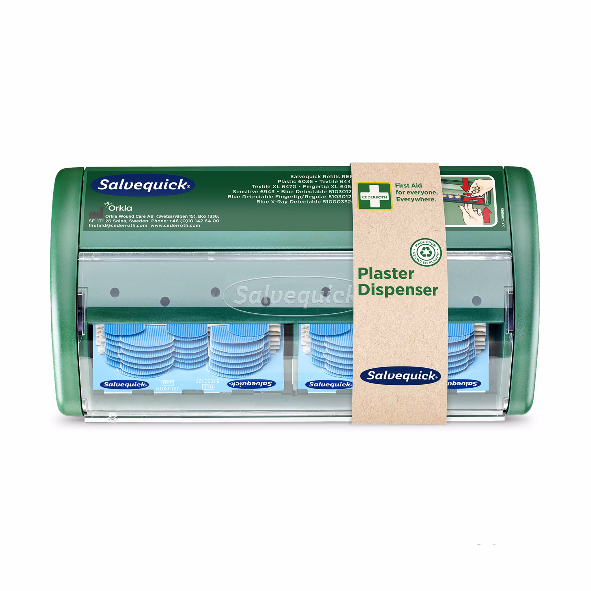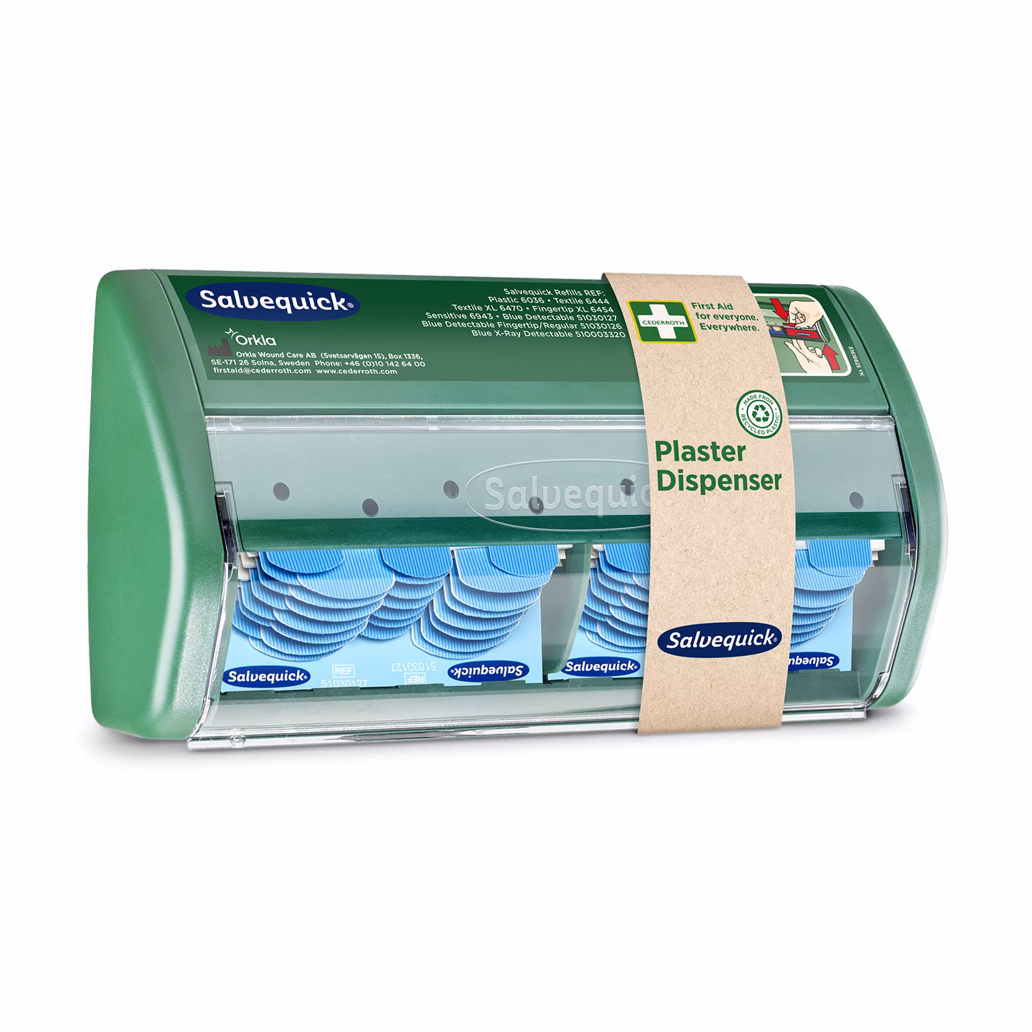 Plåsterautomat speciellt framtagen för användning inom livsmedelsindustrin. Plåstren dras nedåt för att undvika kontaminering av övriga plåster, och refillerna är fastlåsta för att förhindra svinn. De blå plåstren är både visuellt lätta att upptäcka och detekterbara av de flesta metalldetektorer, vilket gör dem idealiska i miljöer med höga hygienkrav. Transparent lock skyddar mot damm. Från sommaren 2025 tillverkas automaten av över 92 % återvunnen plast.