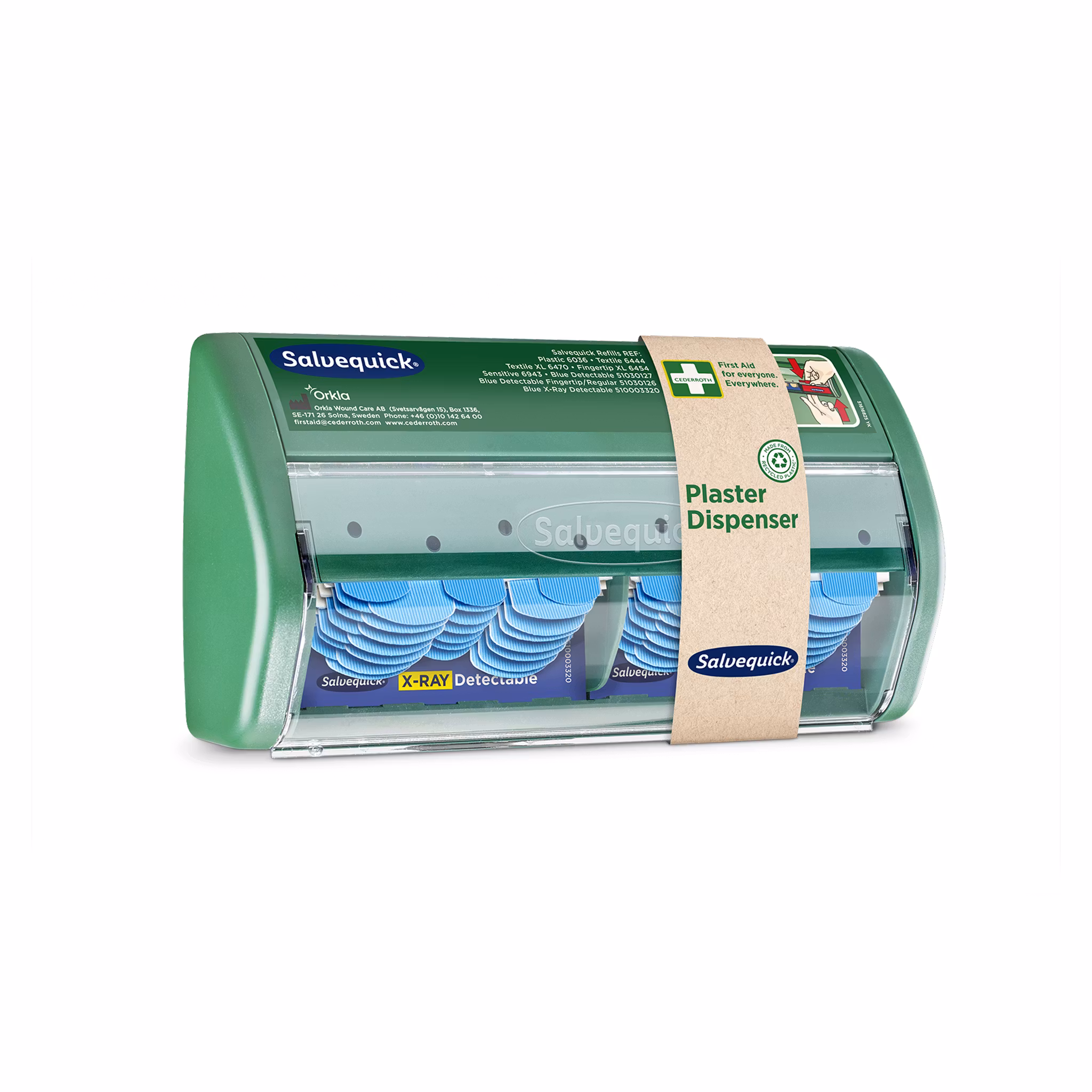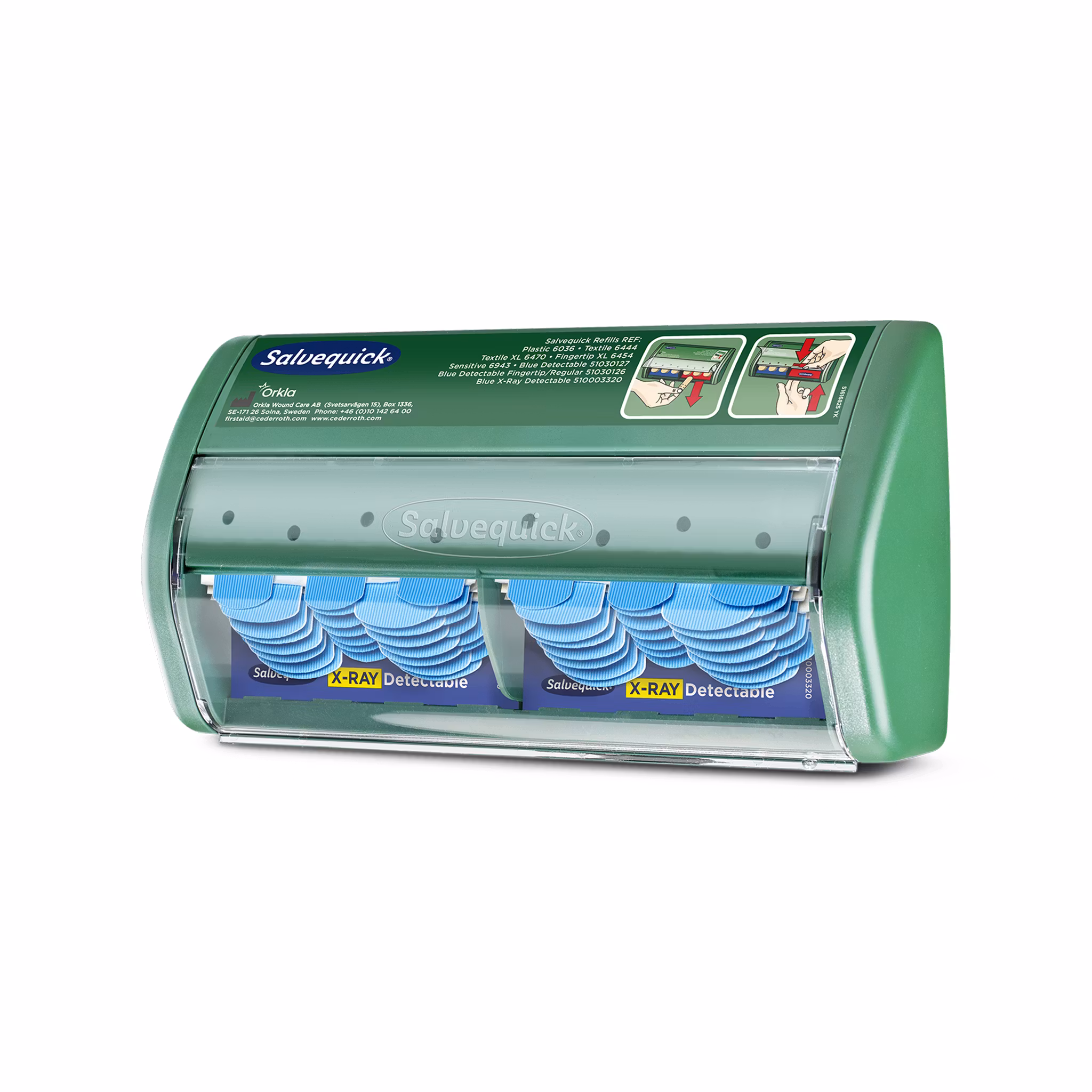 Plåsterautomat speciellt framtagen för livsmedelsindustrin där hög hygien och säkerhet är avgörande. De blå plåstren är både visuellt lätta att upptäcka och detekterbara med röntgen och metalldetektorer. Plåstren dras nedåt för att undvika kontaminering av övriga plåster, och refillerna är fastlåsta för att minska svinn. Transparent lock skyddar mot damm och smuts. Från sommaren 2025 tillverkas automaten av över 92 % återvunnen plast.