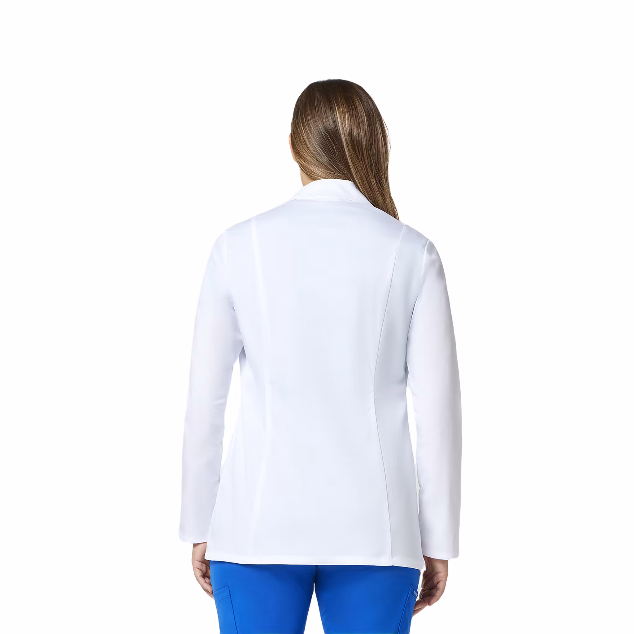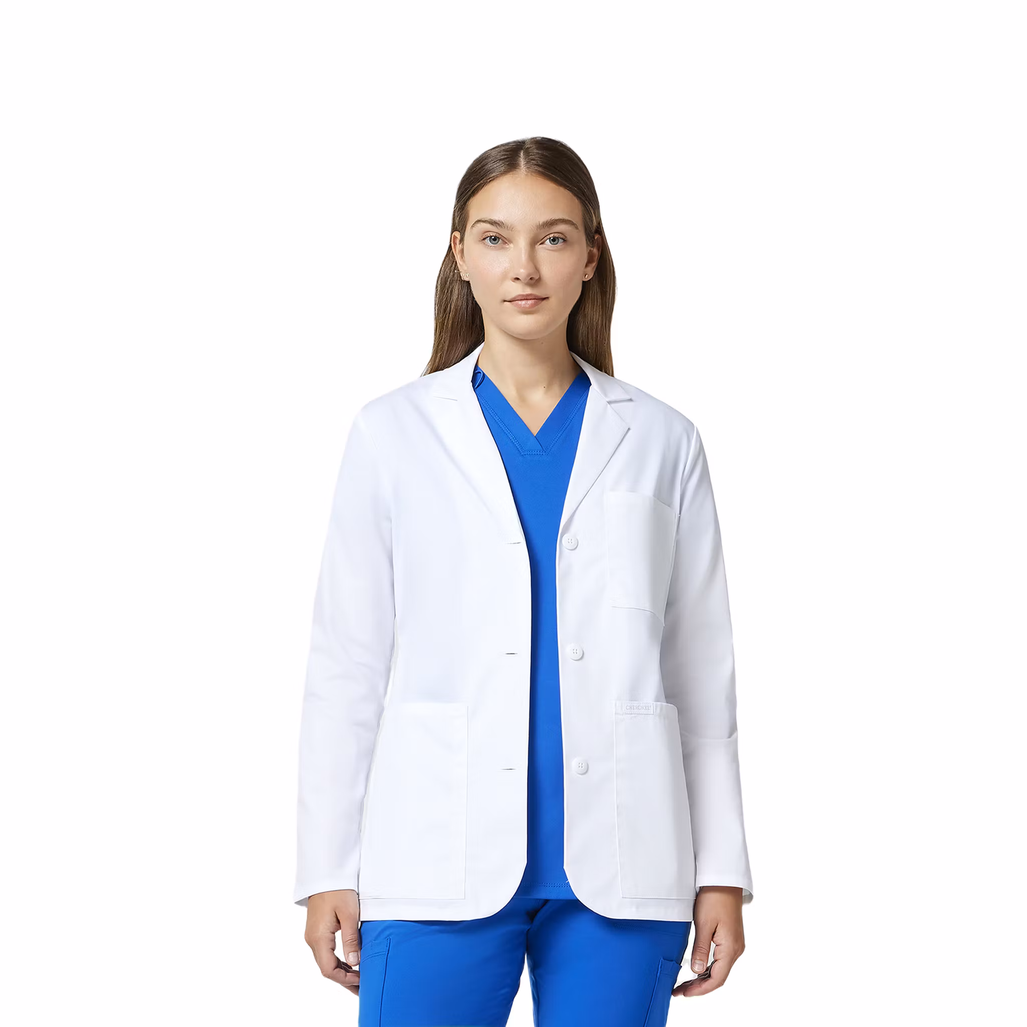 En kortare labbrock i modern klassisk passform, designad för en feminin silhuett med formande prinsessömmar. Modellen har stilrena slag och treknäppning framtill som ger ett professionellt intryck i kliniska miljöer. Rocken har en rundad nederkant framtill och överlappande front som ger en smidig och följsam passform. Tre praktiska fickor ger enkel förvaring, inklusive bröstficka och rymliga framfickor anpassade för arbetsredskap.