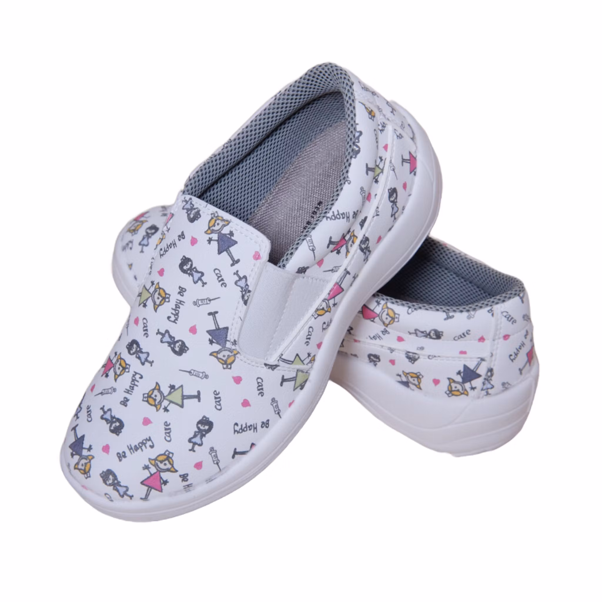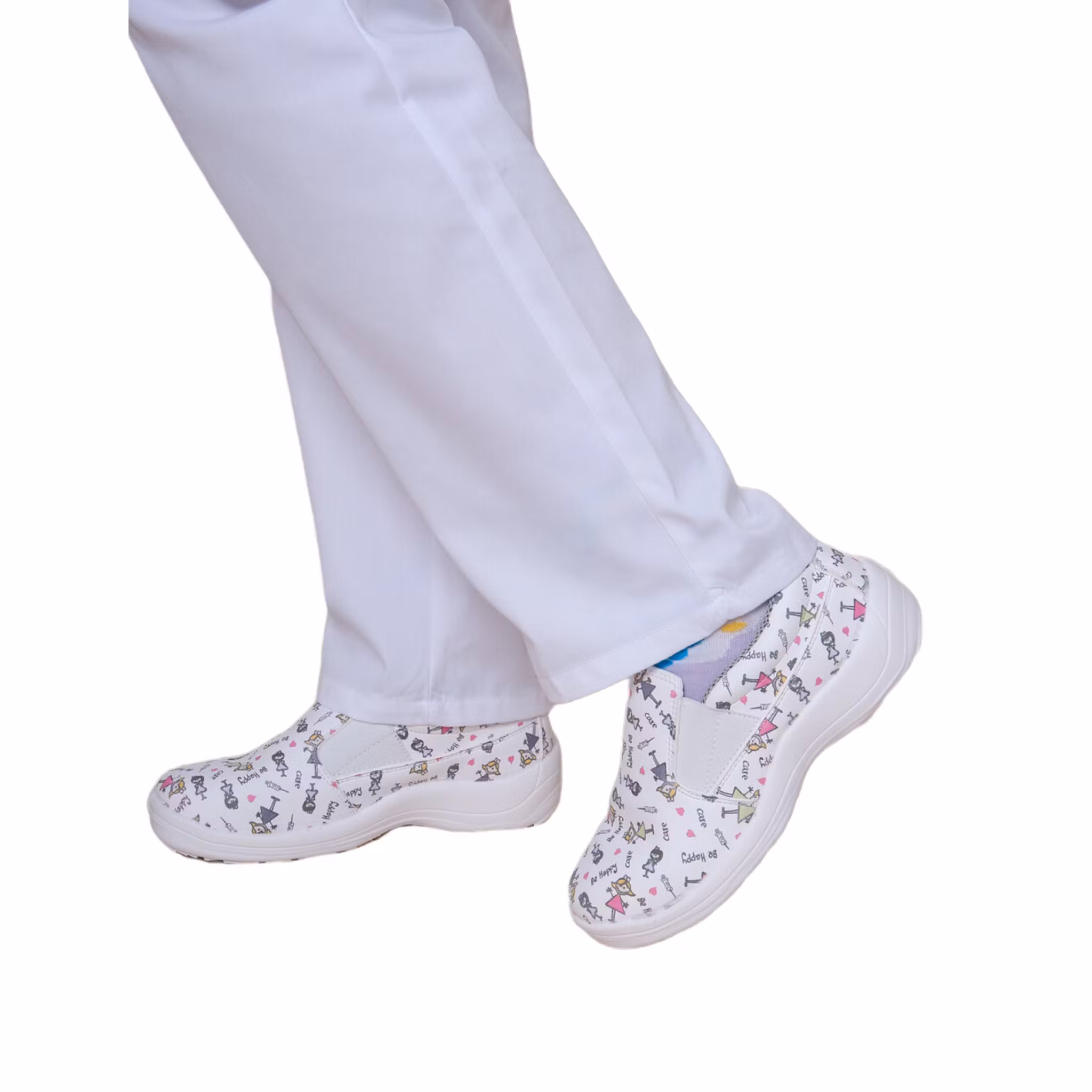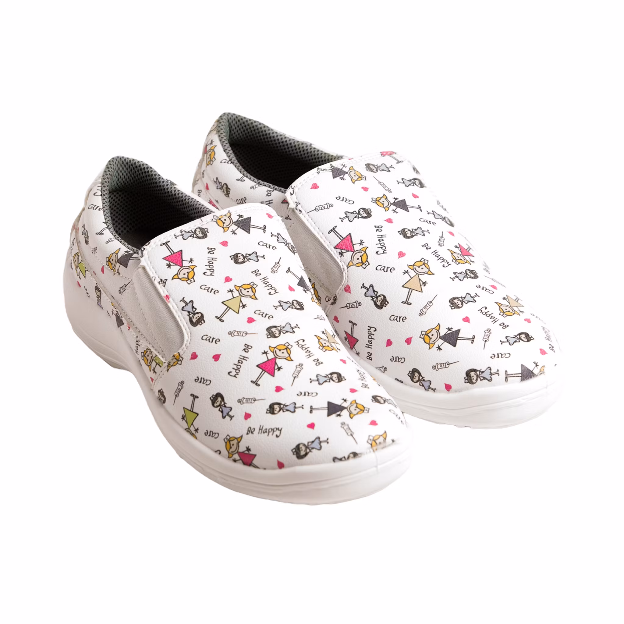 Bekväma och funktionella vårdskor i sneakersmodell med resår, inspirerade av klassisk slip-on-design för enkel på- och avtagning. CARE-modellen har elastiska sidopartier som ger en följsam passform och god stabilitet under hela arbetsdagen. Skorna är utrustade med andningsbart foder och en avtagbar innersula som bidrar till hög komfort och god hygien. Den lätta, antistatiska och halkfria sulan ger tryggt grepp i krävande arbetsmiljöer. Ett lekfullt vårdmönster med sjukvårdsrelaterade illustrationer ger skorna ett personligt uttryck som passar alla typer av yrken inom hälso- och sjukvård.