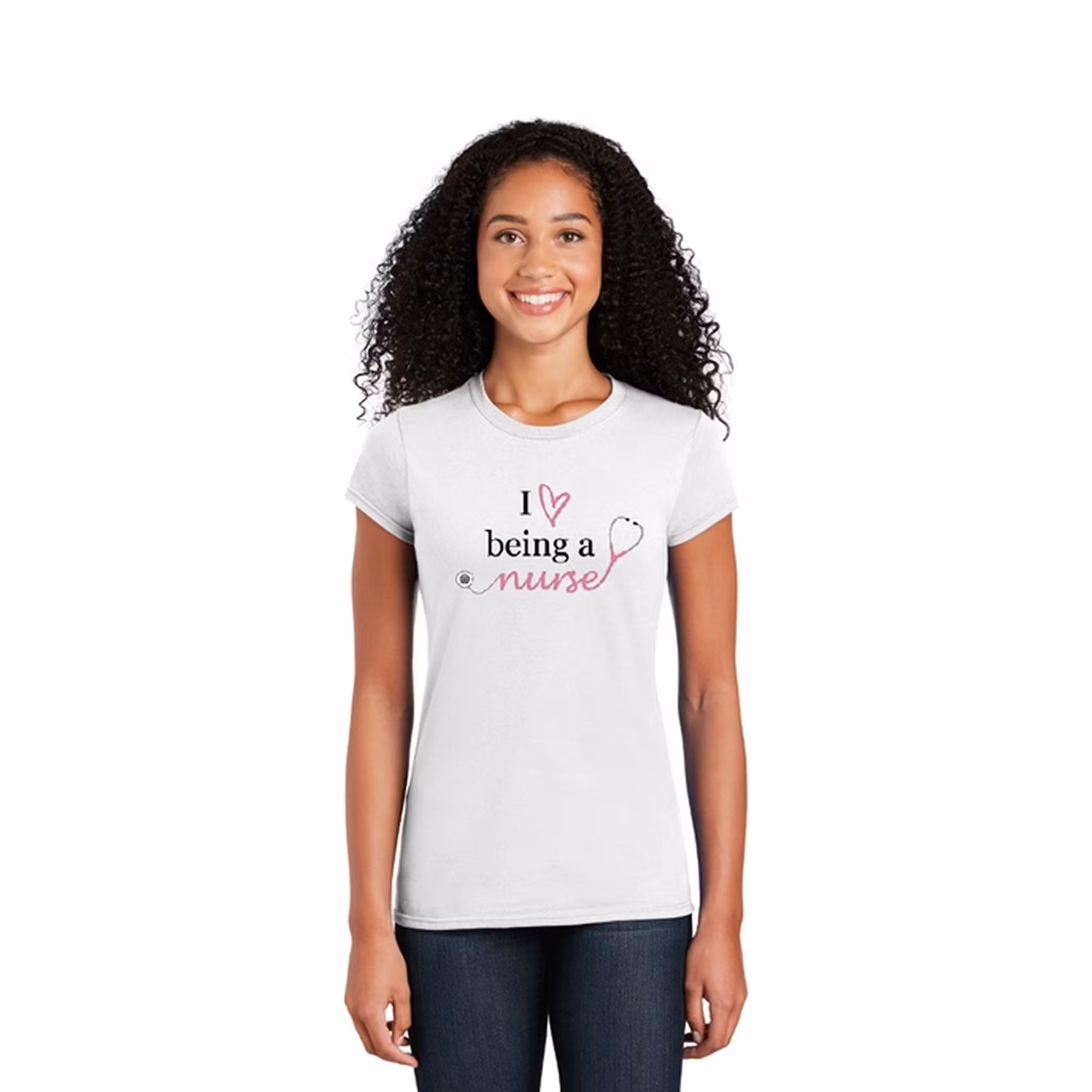 Bekväm och lättburen kortärmad t-shirt framtagen för sjuksköterskor och annan vårdpersonal som vill kombinera funktion med en personlig stil. T-shirten är tillverkad i mjuk 100 % bomull som ger en behaglig känsla mot huden och god andningsförmåga under hela dagen. Den klassiska rundhalsen och den raka passformen gör plagget enkelt att bära både som arbetsplagg och på fritiden. Det tryckta motivet “Love Being A Nurse” ger t-shirten en tydlig identitet och uttrycker stolthet över yrket, samtidigt som den behåller ett stilrent och lättmatchat uttryck. Modellen fungerar väl både som ett vardagsplagg och som ett mer avslappnat inslag i arbetsgarderoben, och passar lätt att kombinera med både vårdkläder och ledigare outfits.