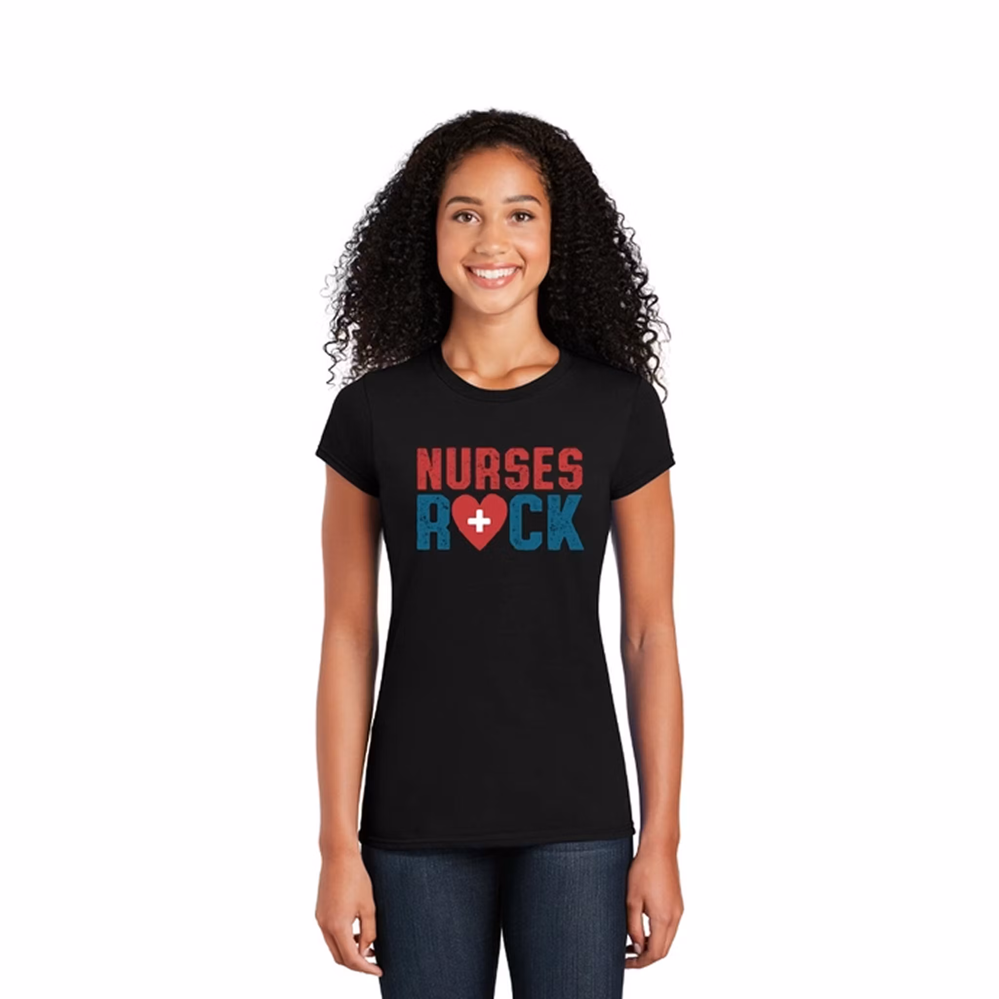 Bekväm och lättburen kortärmad t-shirt framtagen för sjuksköterskor och annan vårdpersonal som vill kombinera funktion med en personlig stil. T-shirten är tillverkad i mjuk 100% bomull som ger en behaglig känsla mot huden och god andningsförmåga under hela dagen. Den klassiska rundhalsen och den raka passformen gör plagget enkelt att bära både som arbetsplagg och på fritiden. Det screentryckta motivet “Nurses Rock” ger t-shirten en tydlig och självsäker identitet, samtidigt som den behåller ett stilrent och lättmatchat uttryck.