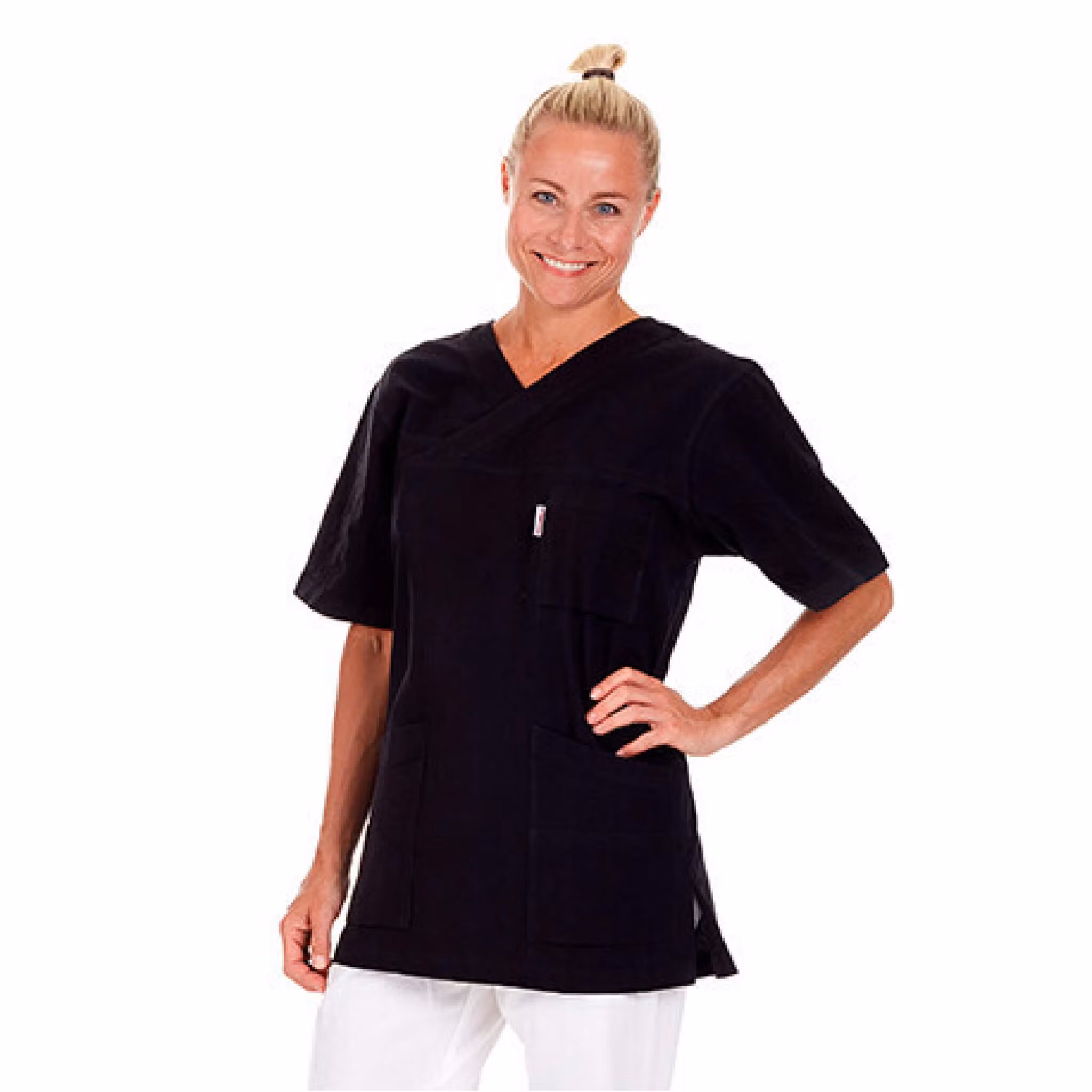 Tunika i mjuk bomull med V-ringning och tre praktiska fickor – två framfickor, varav en med mobilficka, samt en bröstficka. Slits i sidorna ger extra rörelsefrihet. Tillverkad i 100 % krinklad bomull av hög kvalitet.