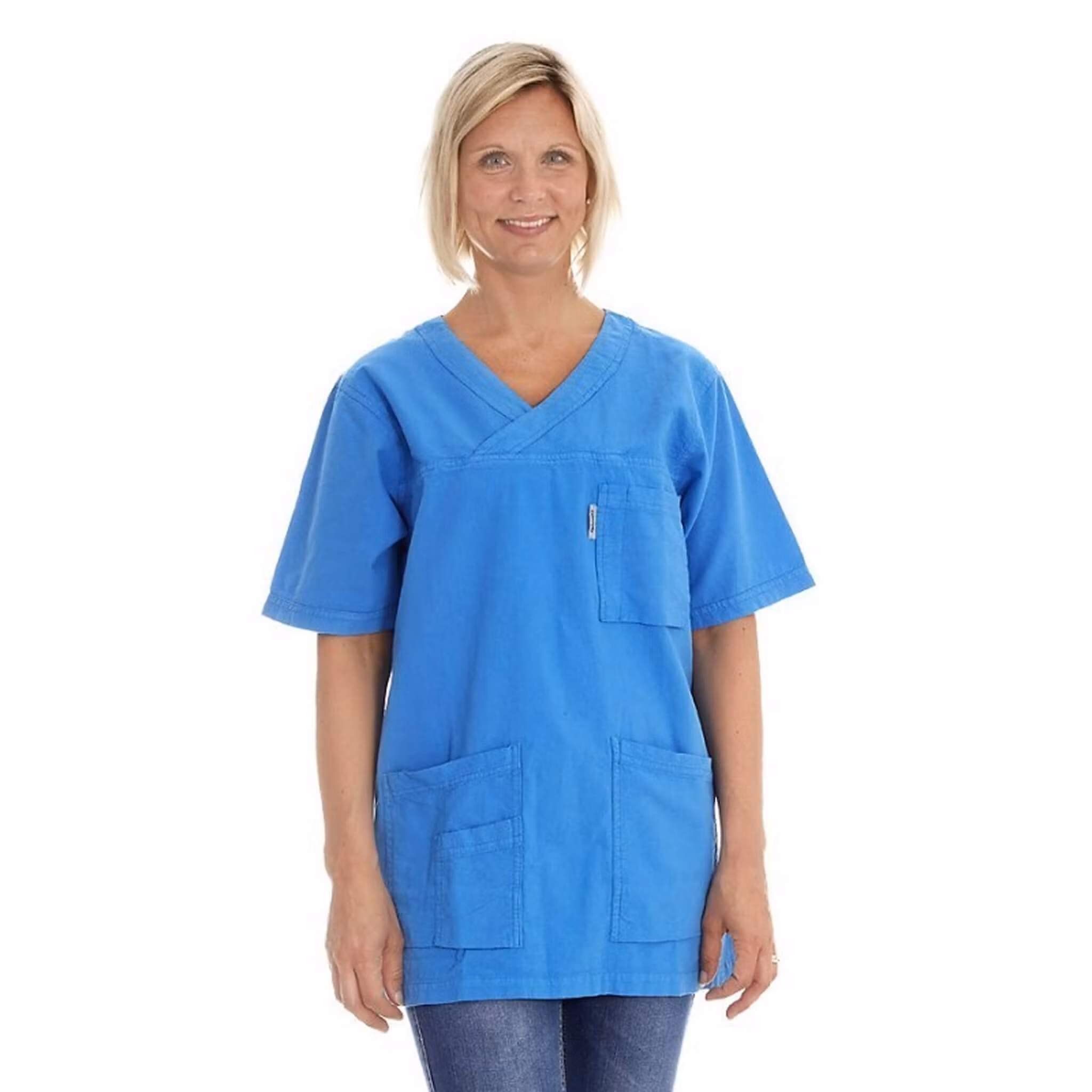 Turkos tunika i mjuk bomull med V-ringning och tre praktiska fickor – två framtill, varav en med mobilficka, samt en bröstficka. Slits i sidorna för ökad rörelsefrihet. Tillverkad i 100 % krinklad bomull.