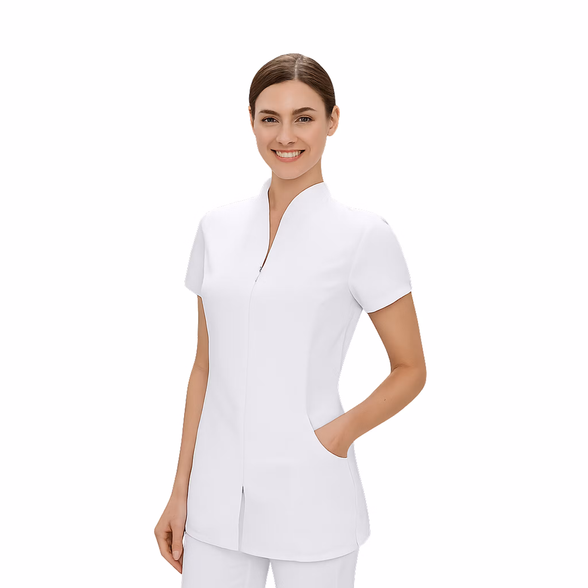 Arbetstunika för kvinnor avsedd för medicinsk miljö, särskilt för sjuksköterskor, medicinska sekreterare eller yrkesverksamma inom skönhetsvård. Den delvis insvängda passformen ger ett elegant uttryck och med insnitt i ryggen framhävs bärarens siluett samtidigt som hög komfort bibehålls. Den diskreta dragkedjan gör tunikan enkel att ta på och av, och den stående kragen tillför en stilren detalj till plagget. Korta ärmar ger rörelsefrihet och håller användaren sval under arbetsdagen. Tunikan kombinerar stil, komfort, praktisk funktion och professionellt uttryck.