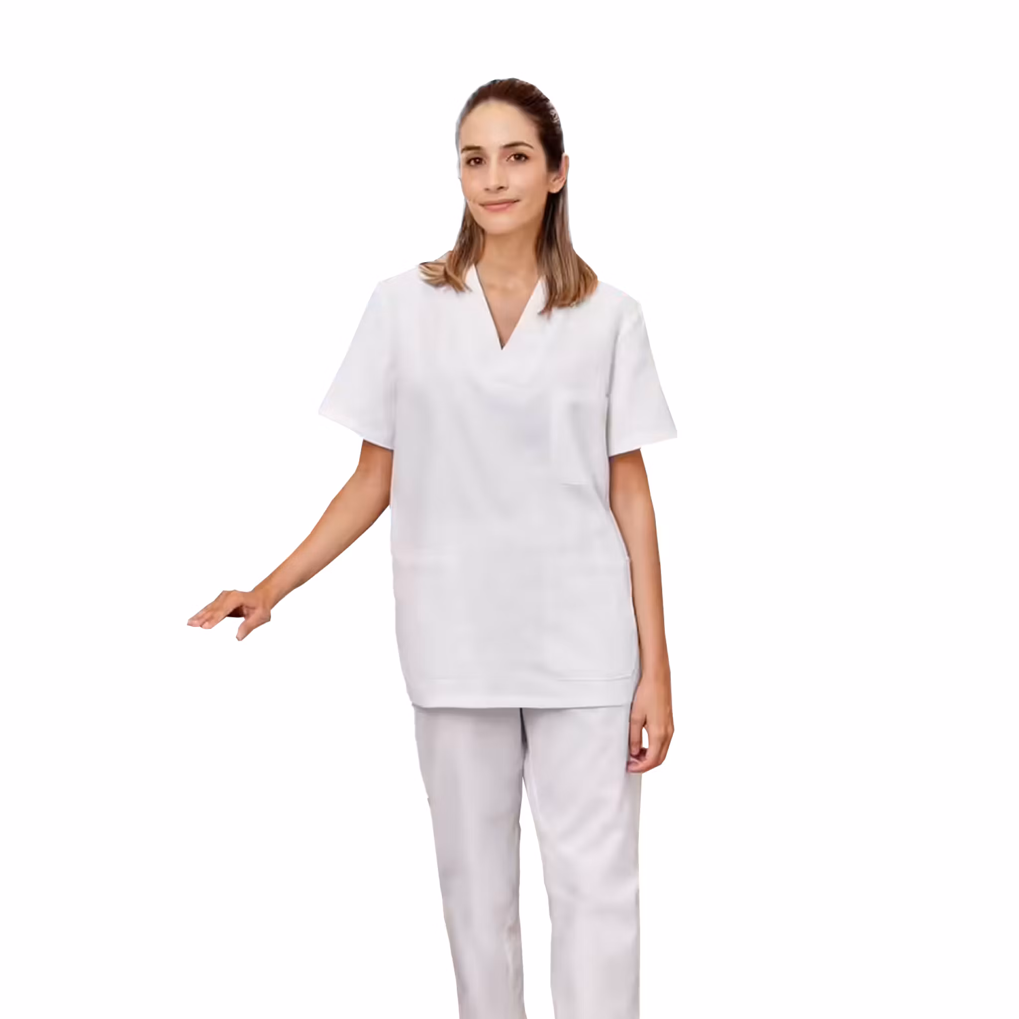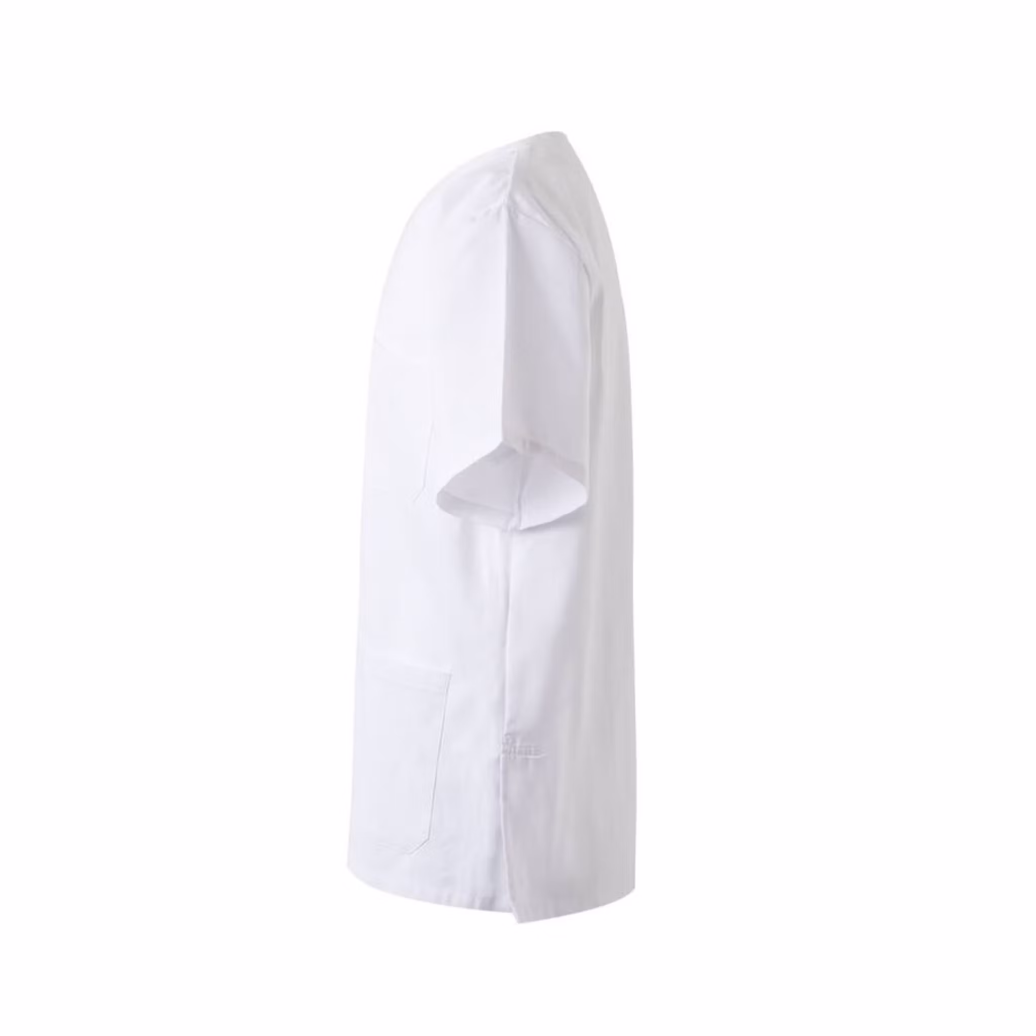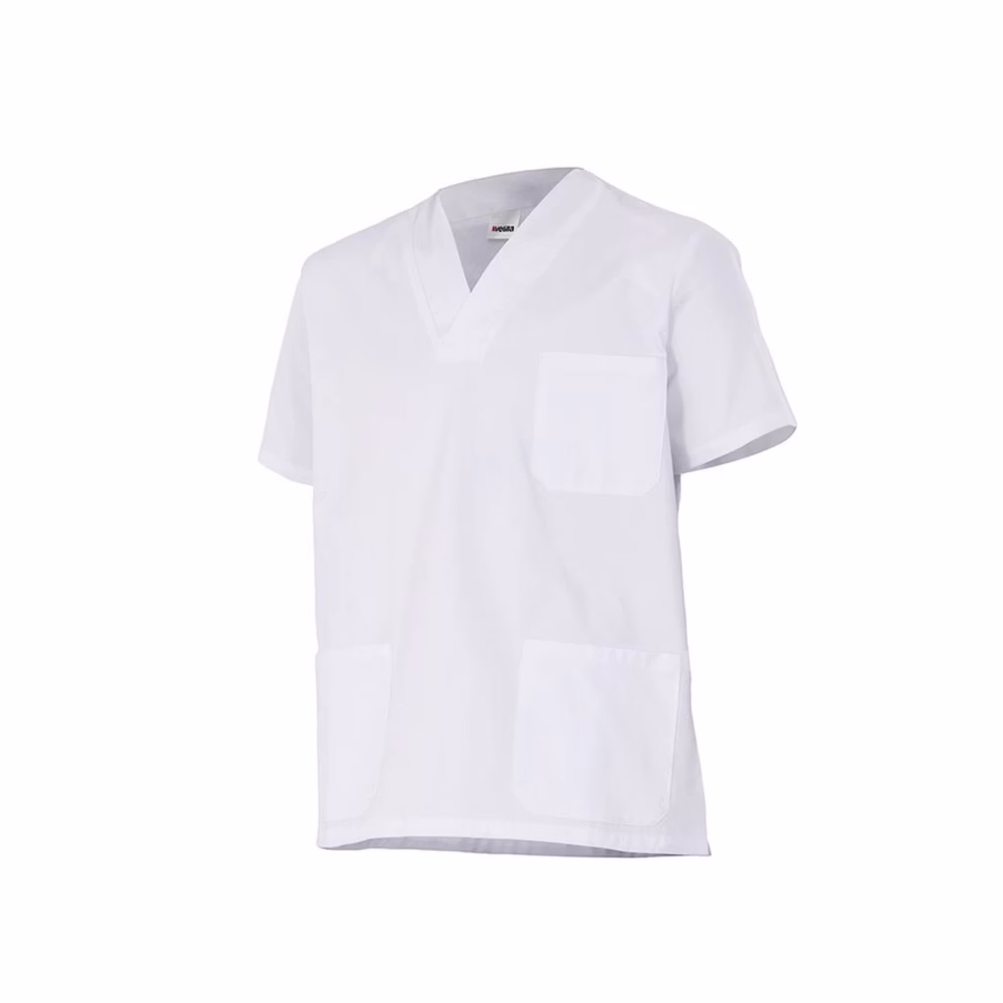 Vit tunika helt tillverkad i bomull med en vikt på 190 g/m², avsedd för yrkesverksamma inom vårdsektorn. Materialet garanterar optimal komfort under hela dagen så att användaren kan arbeta utan stress. Bomull är dessutom lätt att underhålla och kan maskintvättas i 60°C utan att tygets kvalitet försämras. Tunikan har en stilren skärning med V-ringning och sidslitsar vid höfterna som gör den lätt att ta på och röra sig i. Kortärmad och designad för att kombinera praktisk funktion, komfort och stil – kännetecknande för Velillas yrkeskläder. Med tre påsydda fickor får användaren plats med pennor, sax, ID-bricka eller mindre medicinsk utrustning.