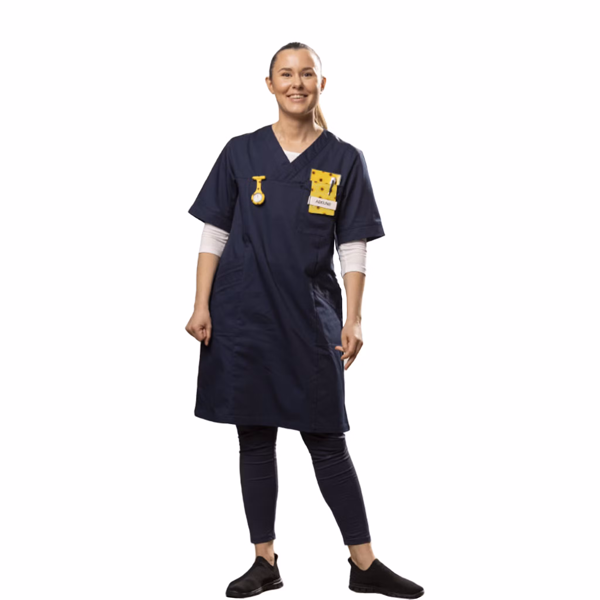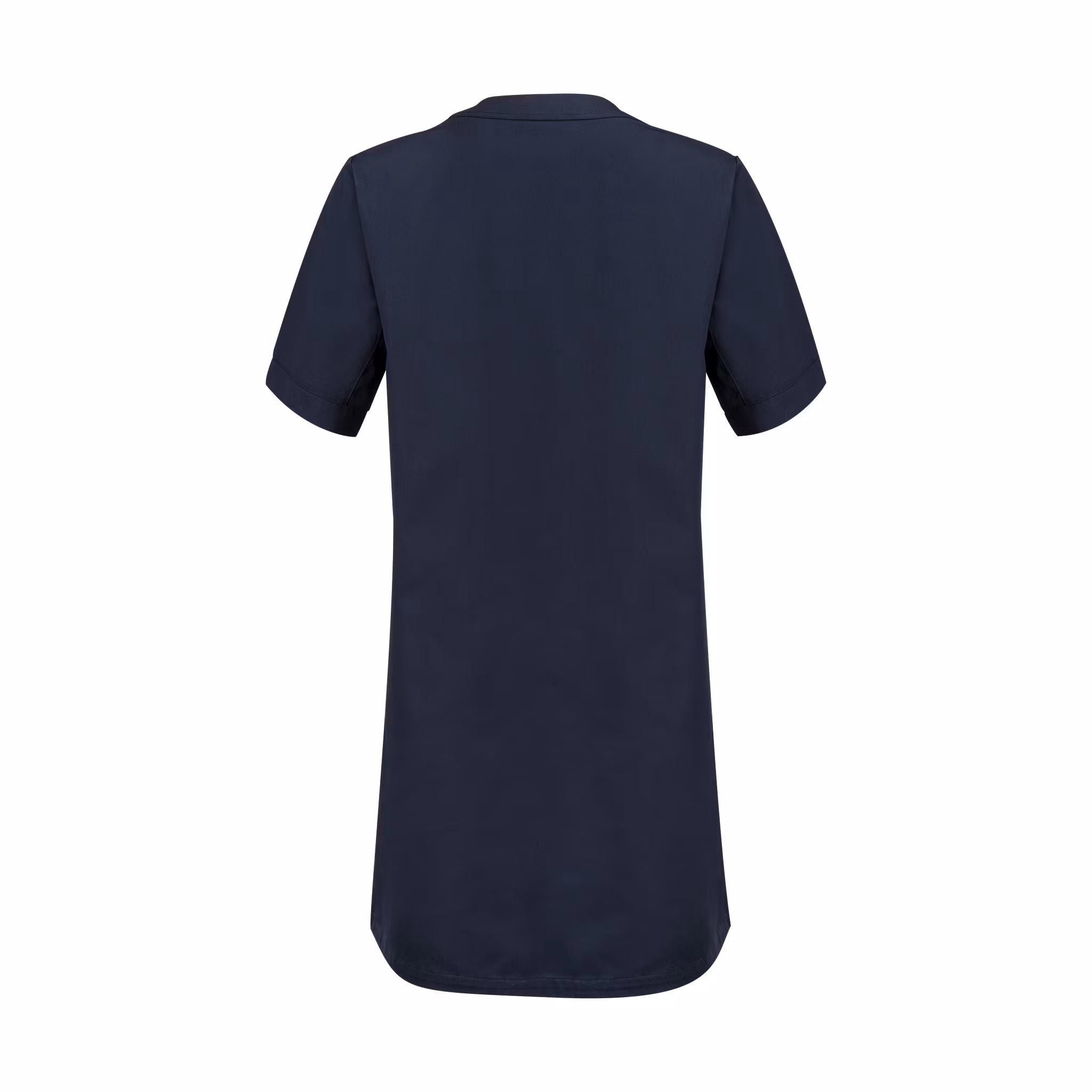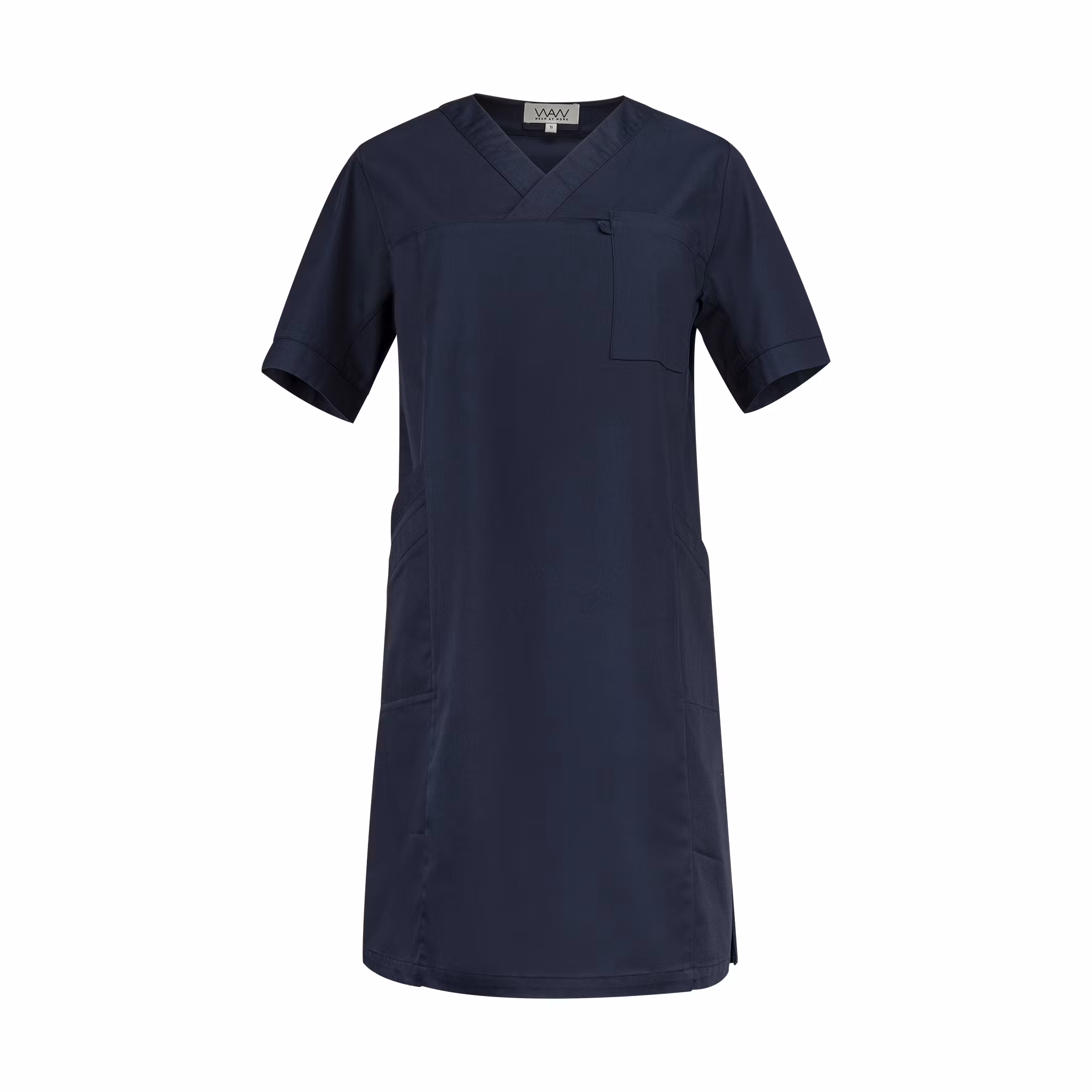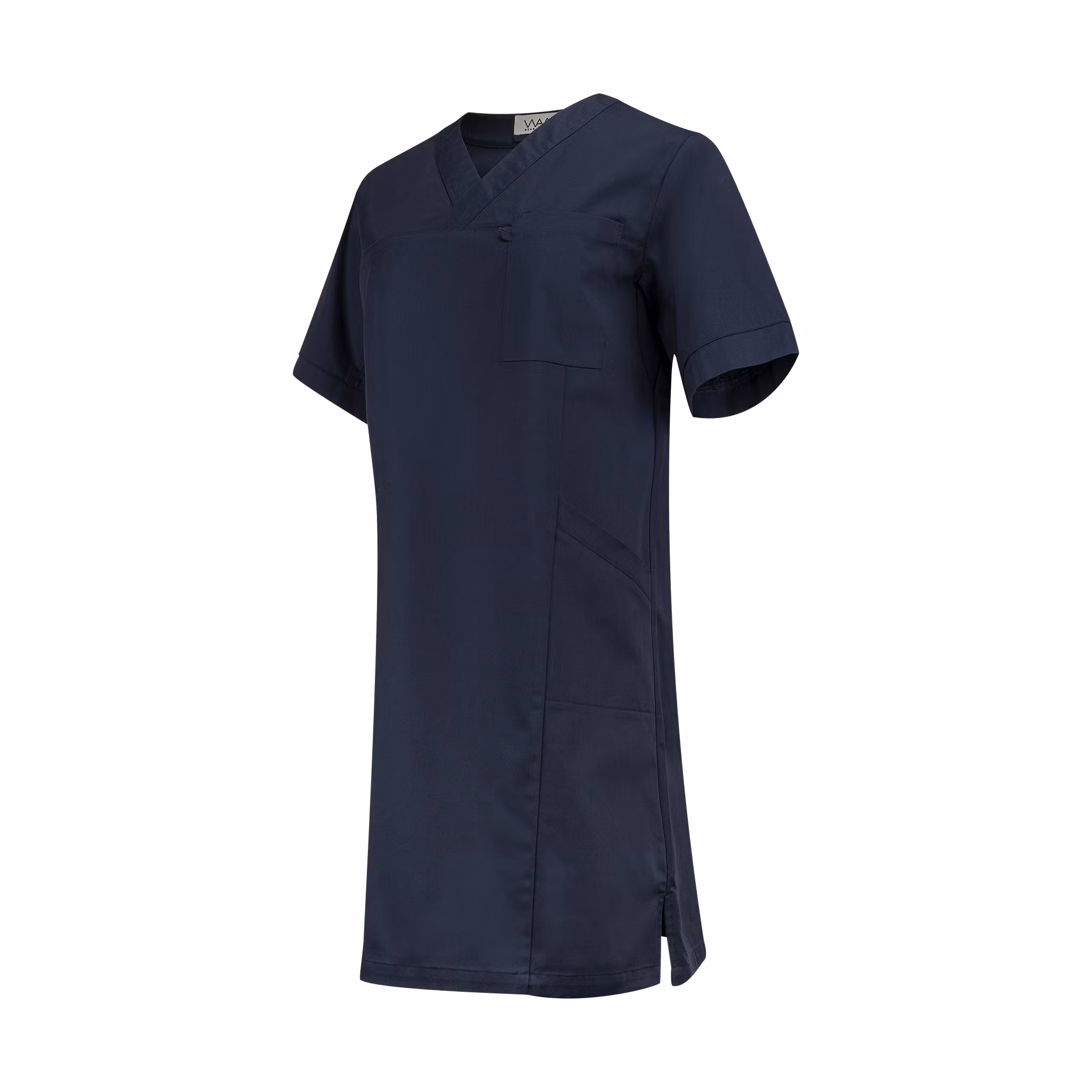 En bekväm och elegant vårdklänning i en längd som passar de flesta. Modellen är snyggt skuren med god rörelsefrihet och är tillverkad i ett slitstarkt, färgbeständigt material som tål tvätt i upp till 85 °C. Den korta ärmen och den fina v-ringningen ger ett klassiskt och professionellt uttryck som passar både inom vård, omsorg och mottagningsmiljöer.