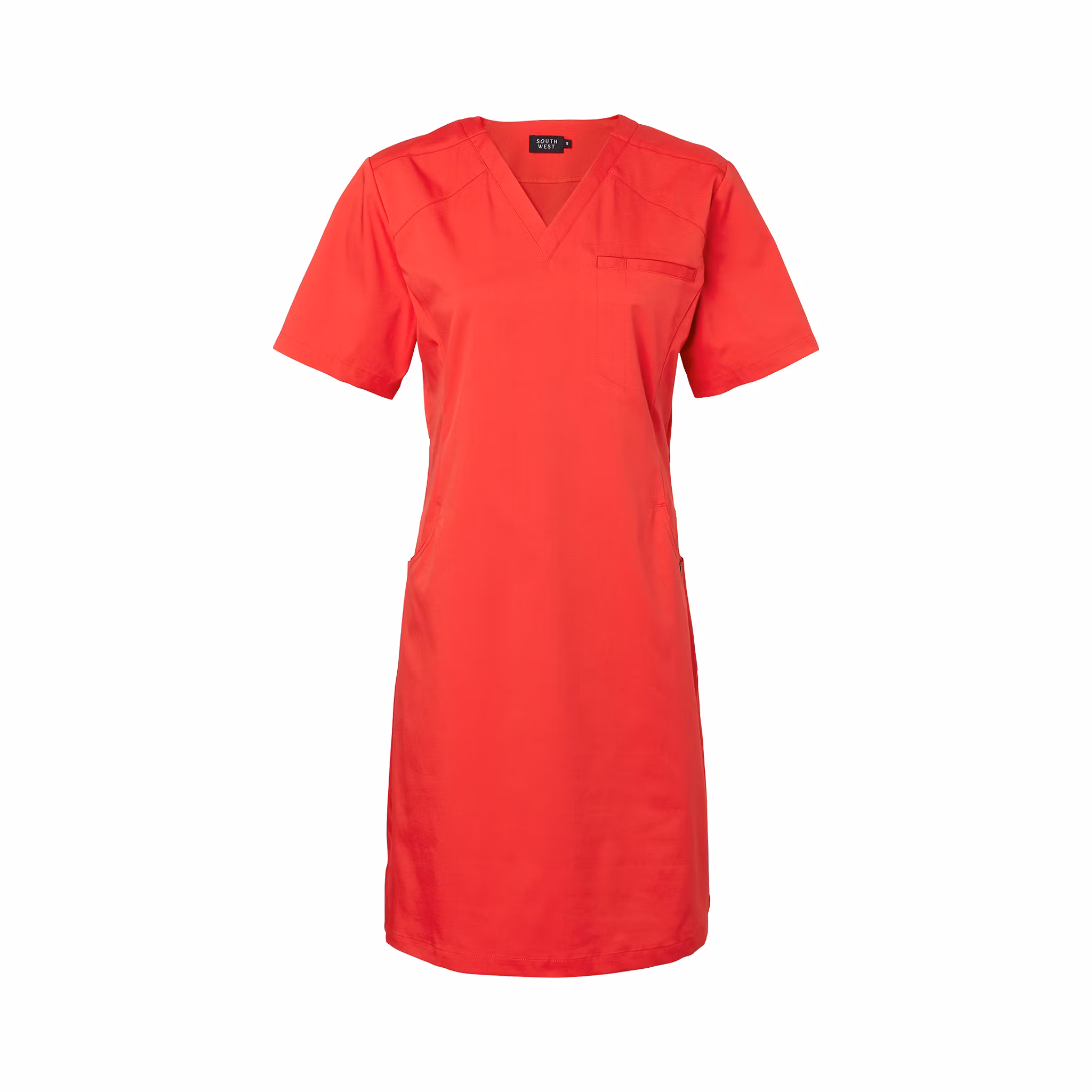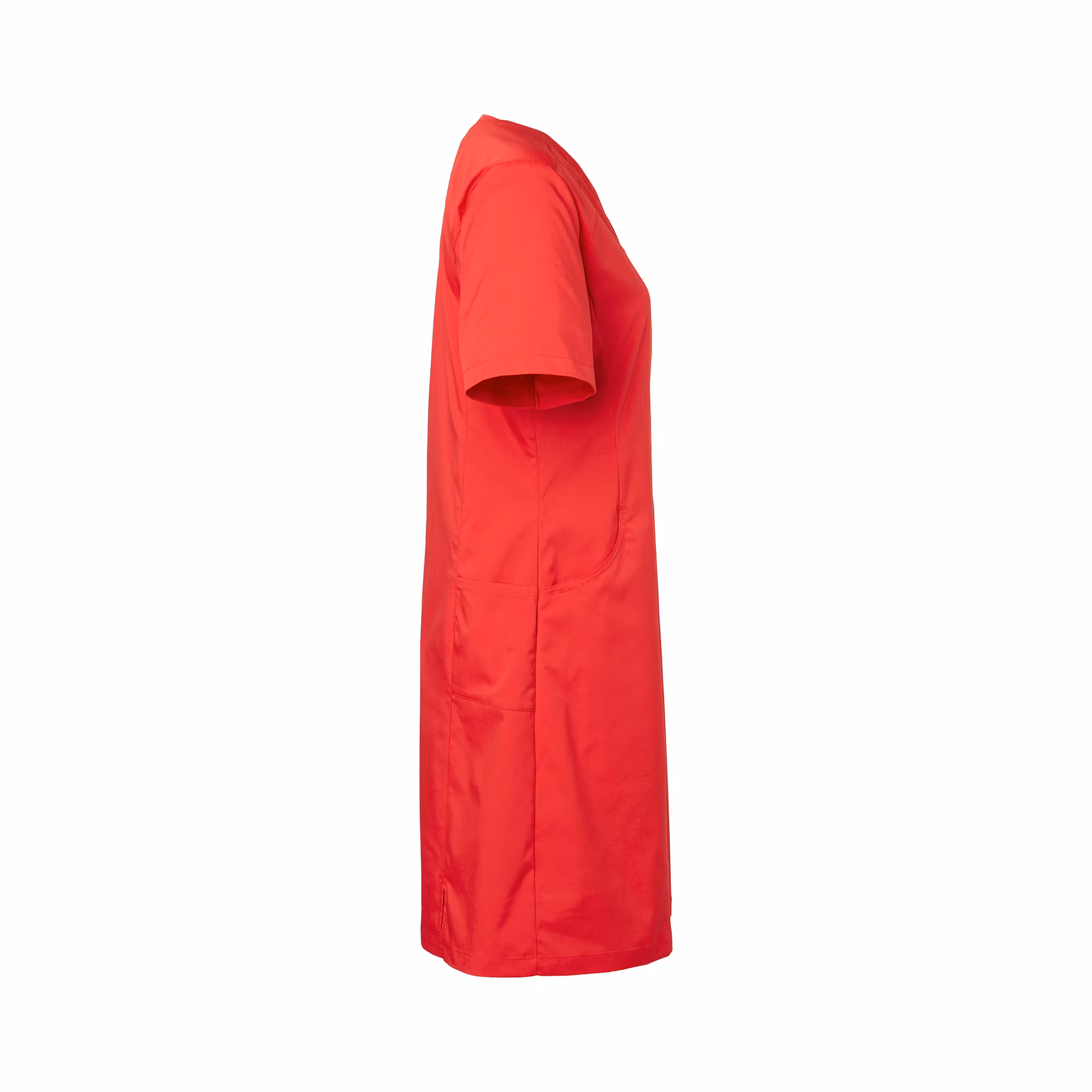 Klänningen är utrustad med praktiska förvaringslösningar som underlättar arbetsdagen, inklusive rymliga framfickor, mobilficka, nyckelring och bröstficka. Sidopaneler med extra fickor samt en diskret slits baktill bidrar till ökad flexibilitet och smidighet i rörelse.