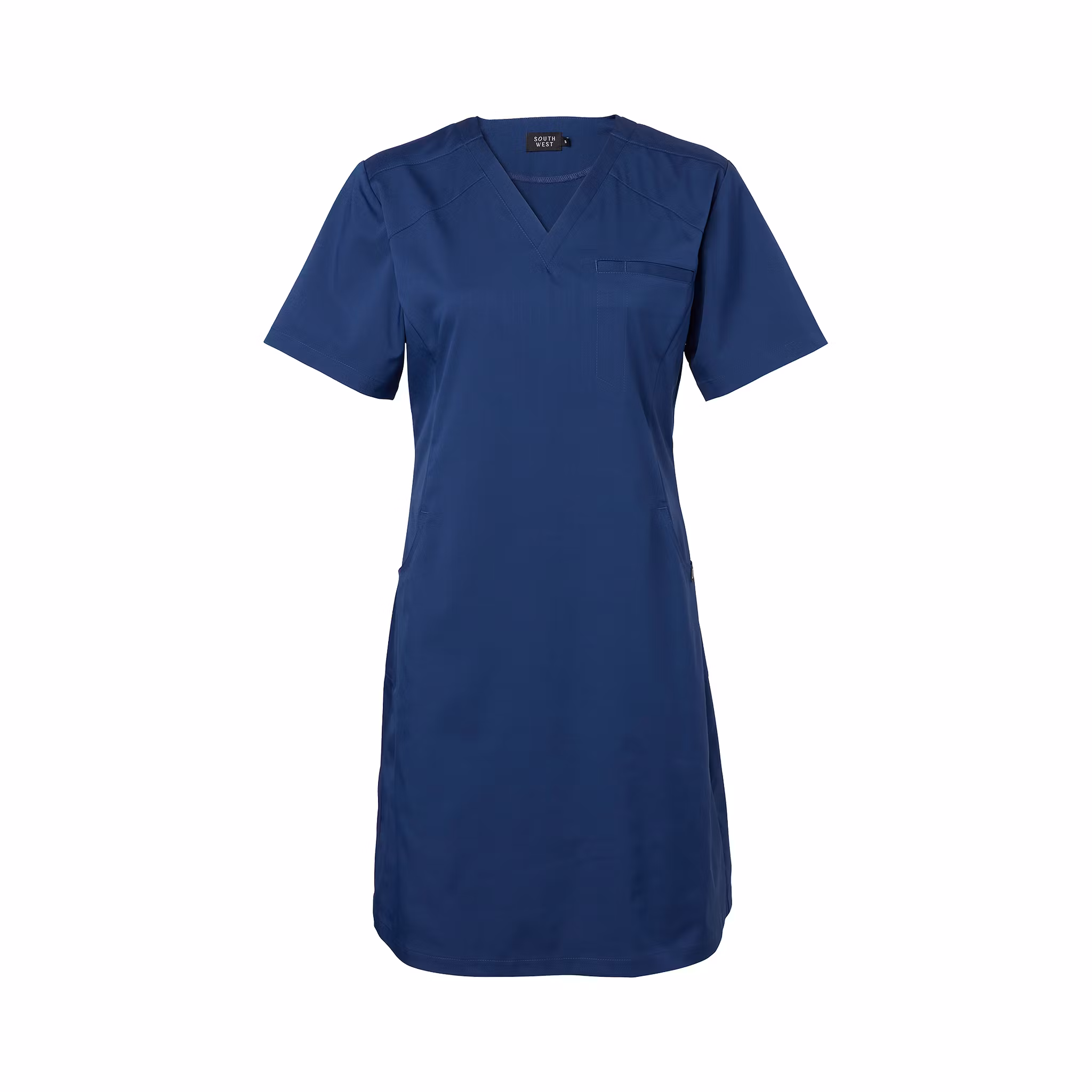 Lovi Dress är en modern och funktionell V-ringad klänning framtagen för arbete inom vård och omsorg. Den figurnära prinsesskärningen och den lätt insvängda midjan ger en feminin och professionell passform samtidigt som plagget behåller god rörelsefrihet.