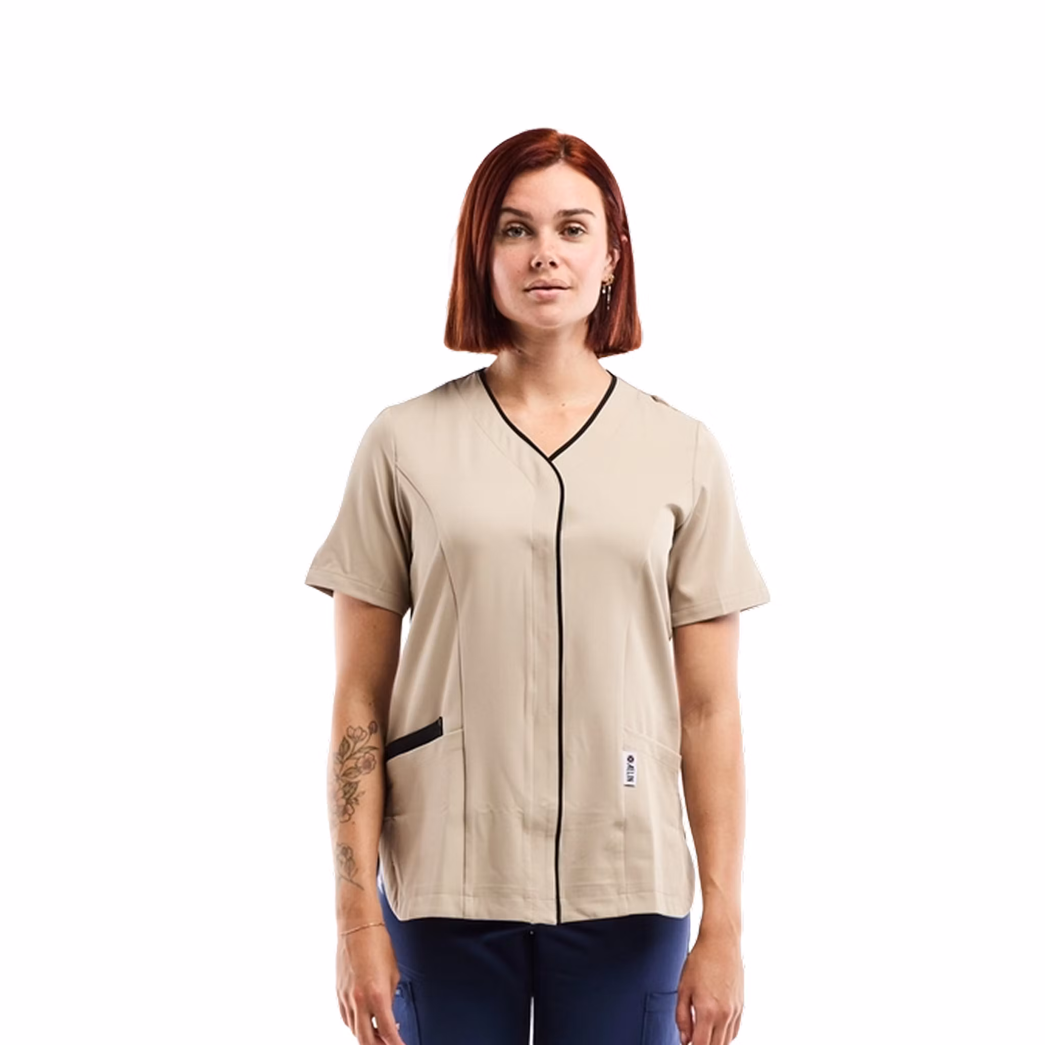 Elegant och funktionell tunika framtagen för arbete inom vård, tandvård och klinikmiljöer. Tunikans design kombinerar ett professionellt uttryck med hög komfort och god rörelsefrihet, vilket gör den väl lämpad för långa och intensiva arbetsdagar. Det stretchiga och ultramjuka materialet ger en behaglig passform och bidrar till god ventilation under hela arbetspasset. Den raffinerade V-ringningen tillsammans med dolda tryckknappar och diskreta kontrasterande detaljer ger ett modernt och välvårdat intryck. Den figursydda passformen, rundade nederkanten och sidoslitsarna skapar en följsam silhuett som samtidigt tillåter naturlig rörelse.