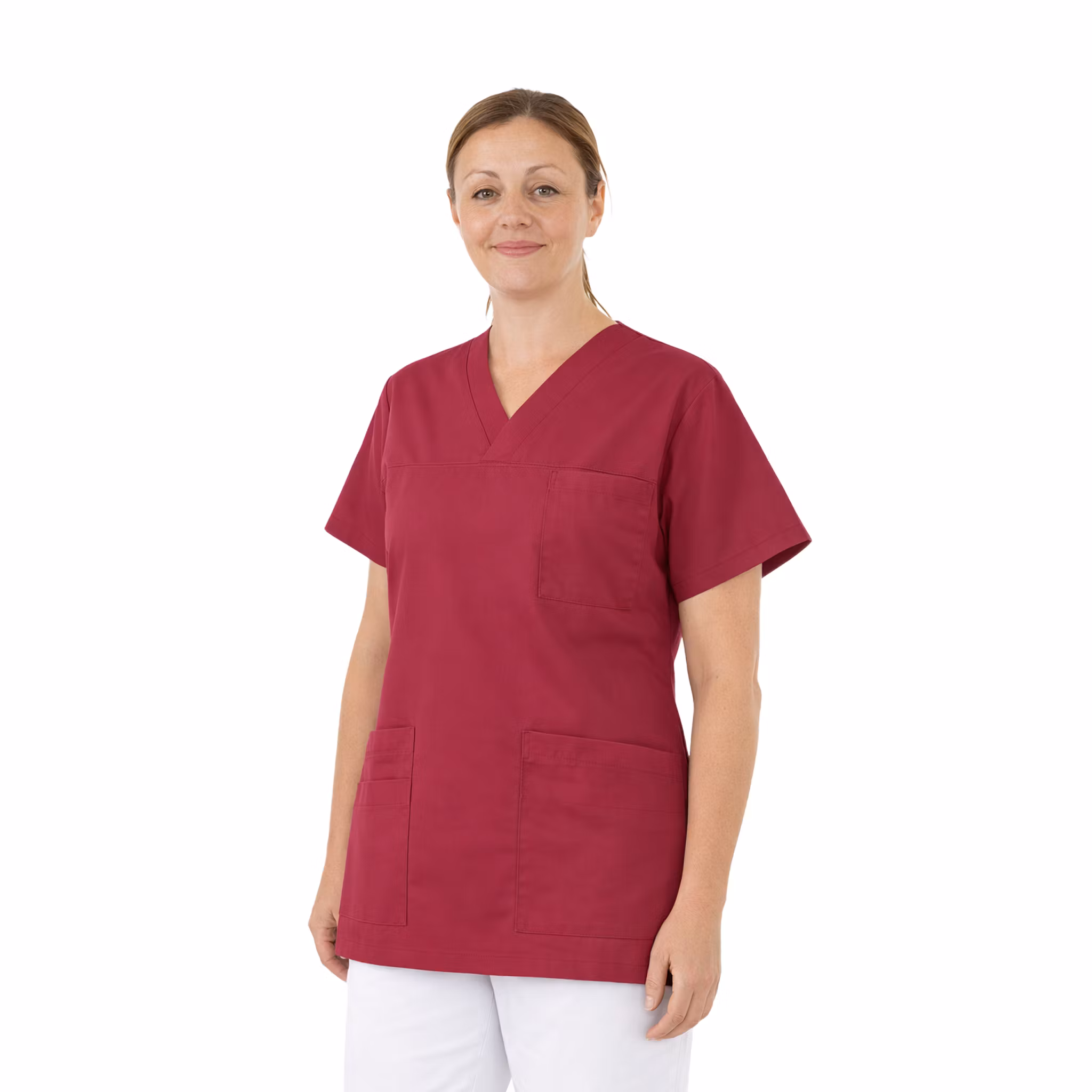 Tunika i slitstarkt tyg av 65 % polyester och 35 % bomullstwill med en vikt på 215 g/m². Tyget är vävt för att tåla daglig användning i vård- och omsorgsmiljöer och ger god formstabilitet även efter upprepade tvättar. Vid första användningen kan materialet kännas något styvt, men det mjuknar snabbt efter tvätt — särskilt efter en första tvätt med mjukmedel. Detta ger plagget en bekvämare och följsammare känsla utan att tumma på hållbarheten.