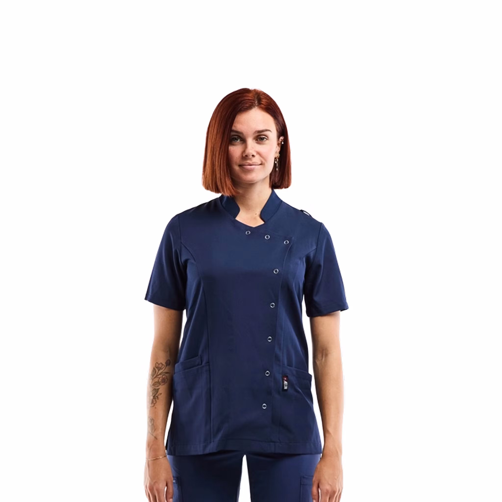 Modern och funktionell tunika framtagen för arbete inom vård, tandvård och klinikmiljöer. Tunikans design kombinerar ett professionellt uttryck med hög komfort och god rörelsefrihet, vilket gör den väl lämpad för långa och intensiva arbetsdagar. Det stretchiga och ultramjuka materialet ger en behaglig passform och bidrar till god ventilation under hela arbetspasset. Ståkragen och den asymmetriska knäppningen med synliga tryckknappar ger ett stilrent och modernt intryck, medan prinsessömmarna skapar en strukturerad och smickrande passform utan att begränsa rörelsefriheten. Sidoslitsarna och rörelsevecken i ryggen bidrar ytterligare till ökad flexibilitet och komfort i vardagen.