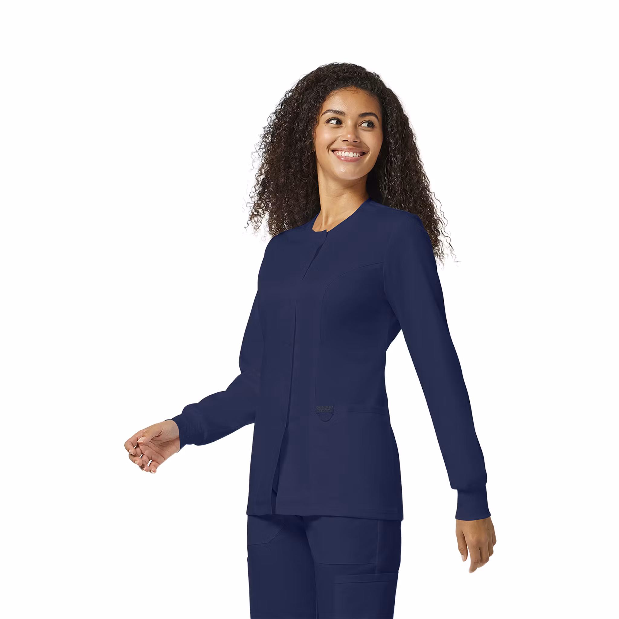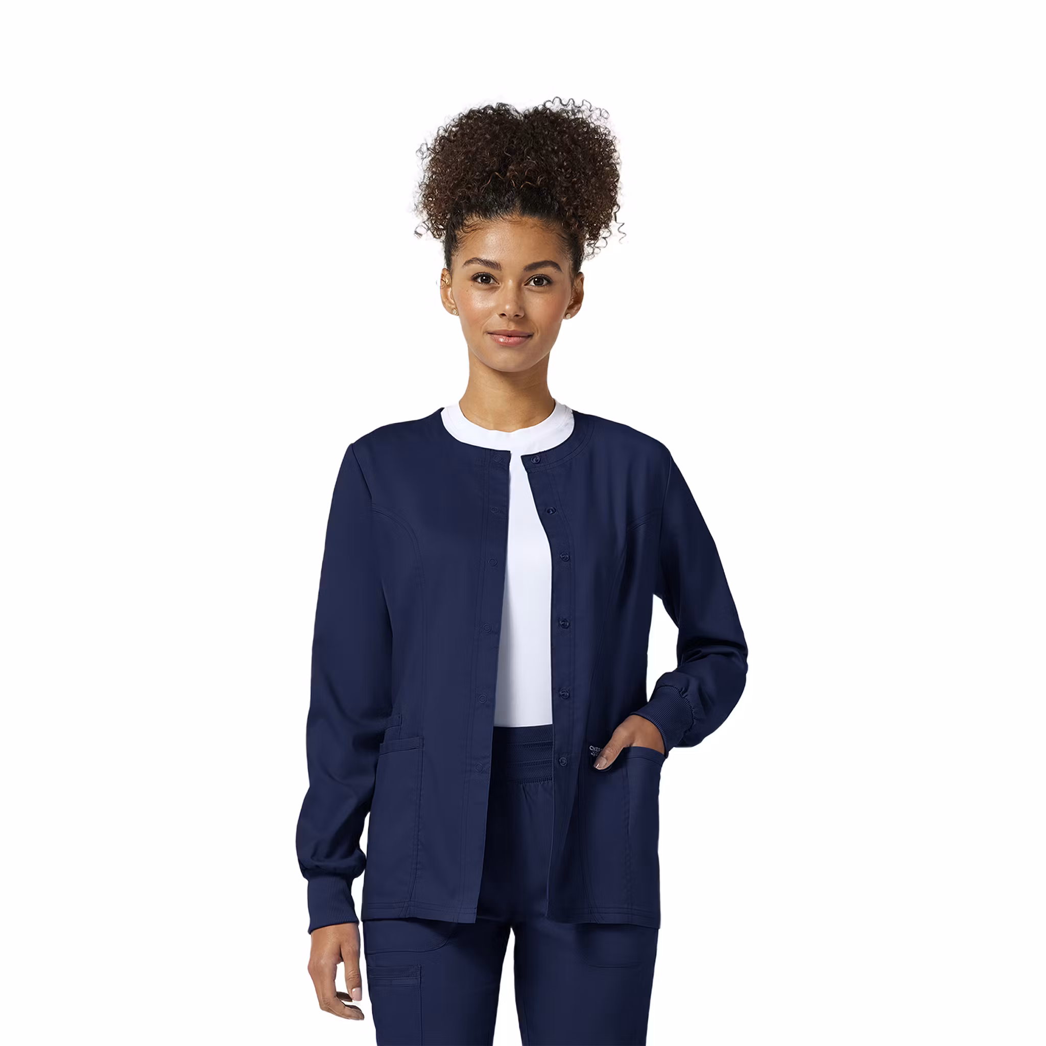 En kort vårdjacka i Modern Classic-passform med tryckknäppning framtill för enkel av- och påtagning. Modellen har prinsessömmar fram och bak samt ryggok som ger en följsam och professionell siluett. Ribbstickade muddar och sidoslitsar bidrar till ökad komfort och rörelsefrihet under arbetsdagen.