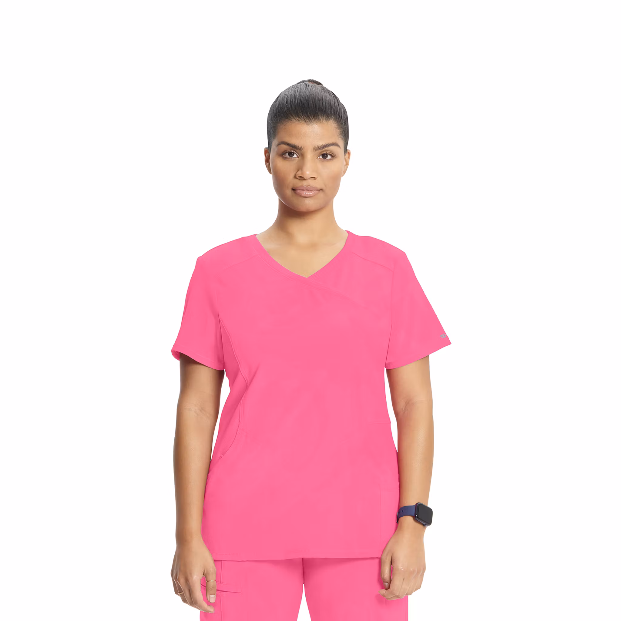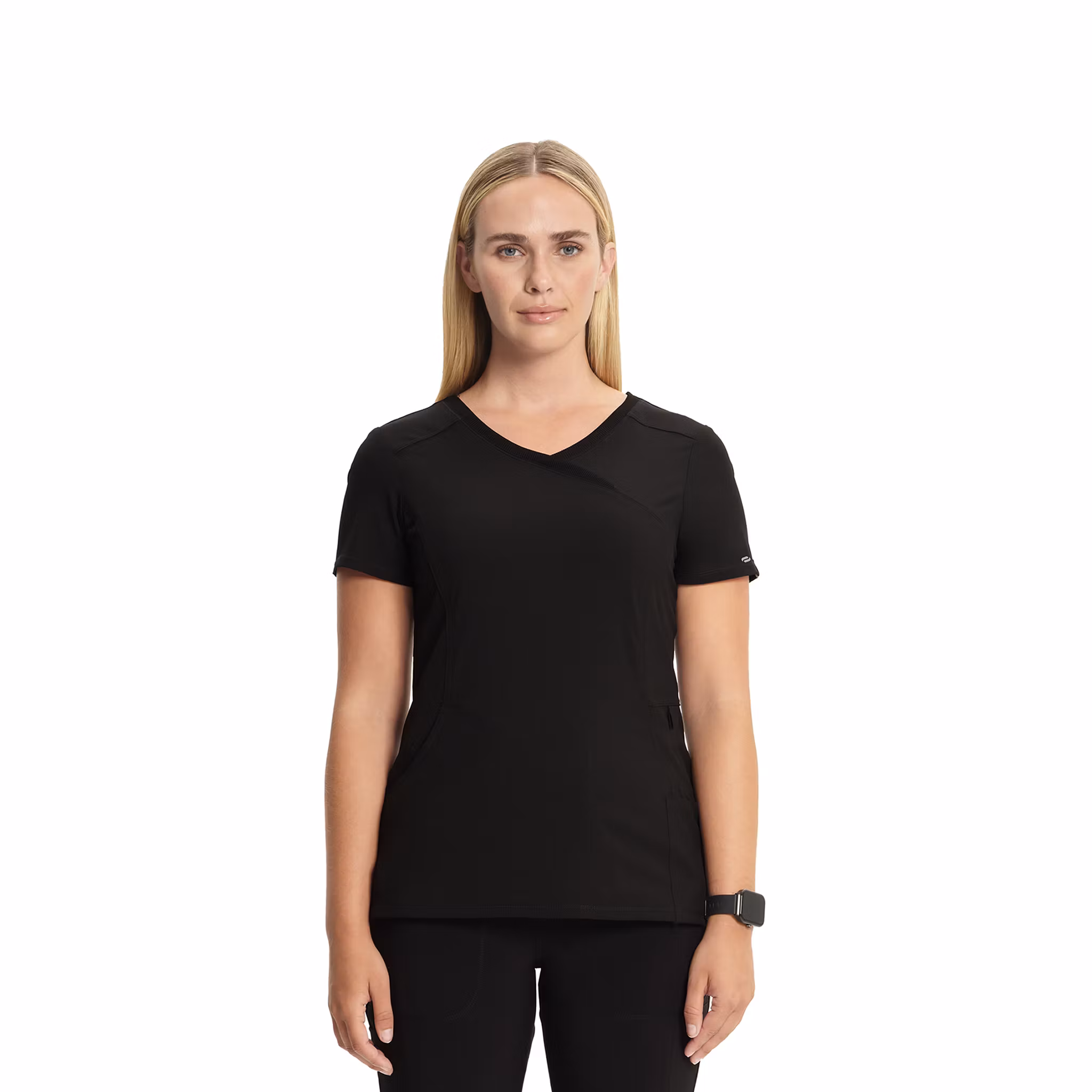 Funktionell vårdtopp ur Infinity-serien med modern omlottdesign och figurnära passform. Den kombinerar slitstark stretchpoplin med elastiska ribbstickade paneler i ryggen, vilket ger både en smickrande silhuett och hög rörelsefrihet under hela arbetsdagen.